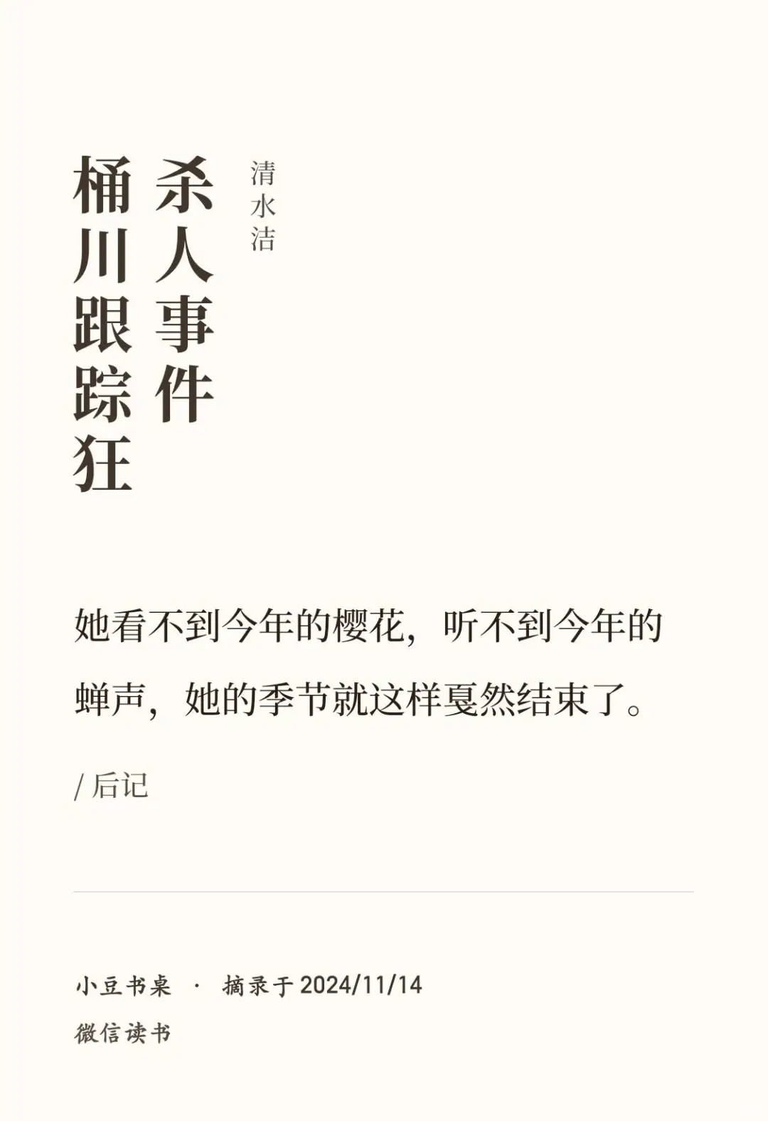 “而诗织她看不到今年的樱花,听不到今年的蝉声,她的季节就这样戛然结束了。”