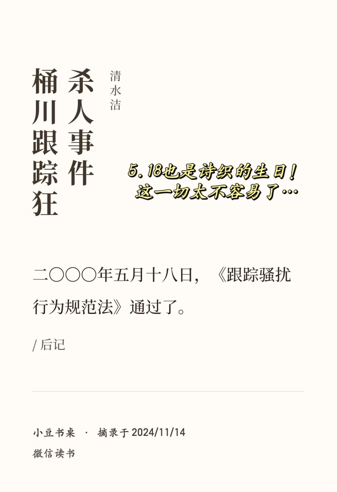 但是好在在桶川的案子之后,2000.5.18《跟 踪 骚 扰行为规范法》通过了。