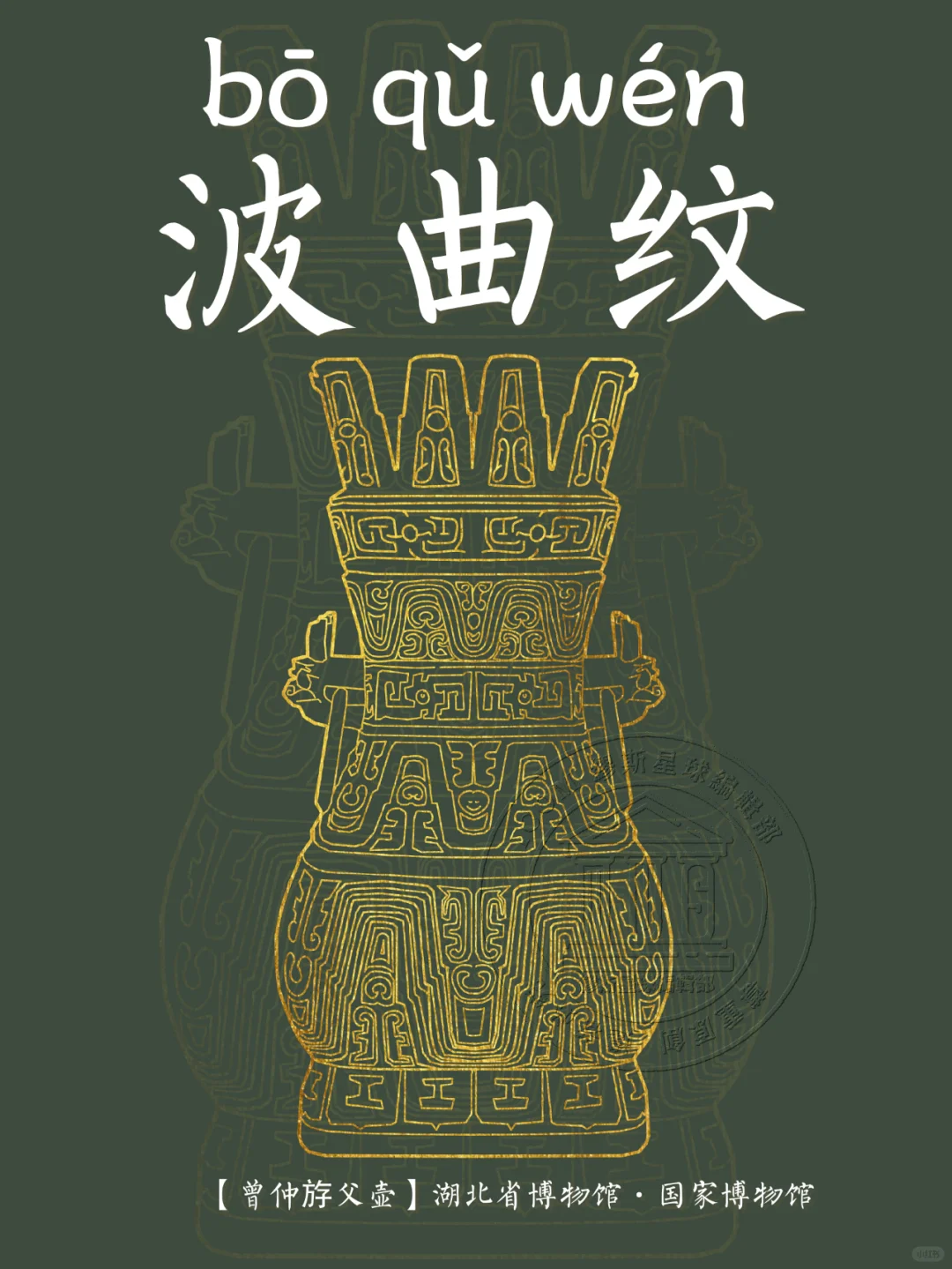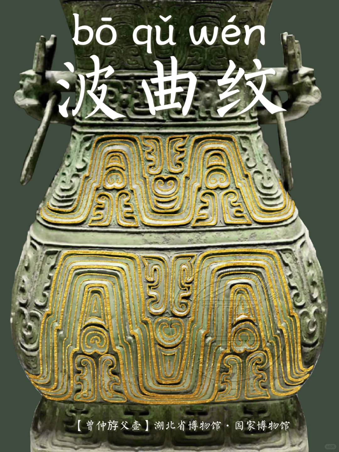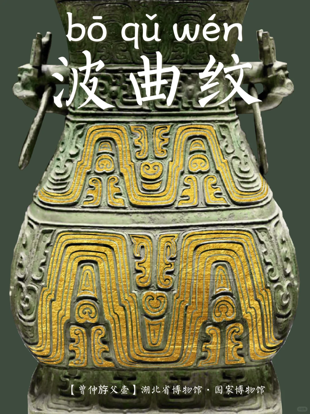 🖋️ 波曲纹:青铜器上的装饰纹样之一,或称波带纹、波线纹、环带纹、山纹、幛纹,状如一条宽阔的带子,呈波状起伏形象,波峰间的空隙常填有近似于眉、口的形象。