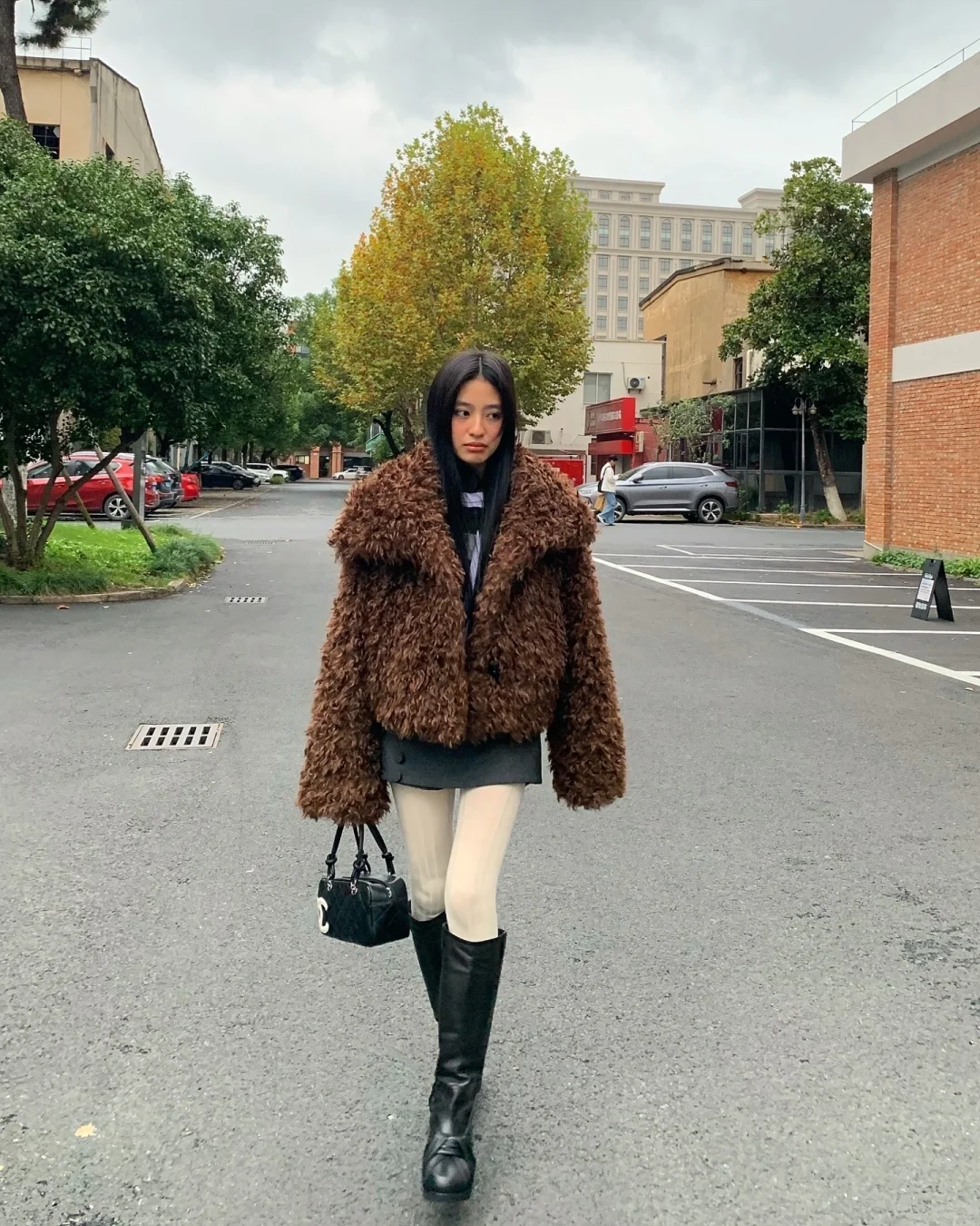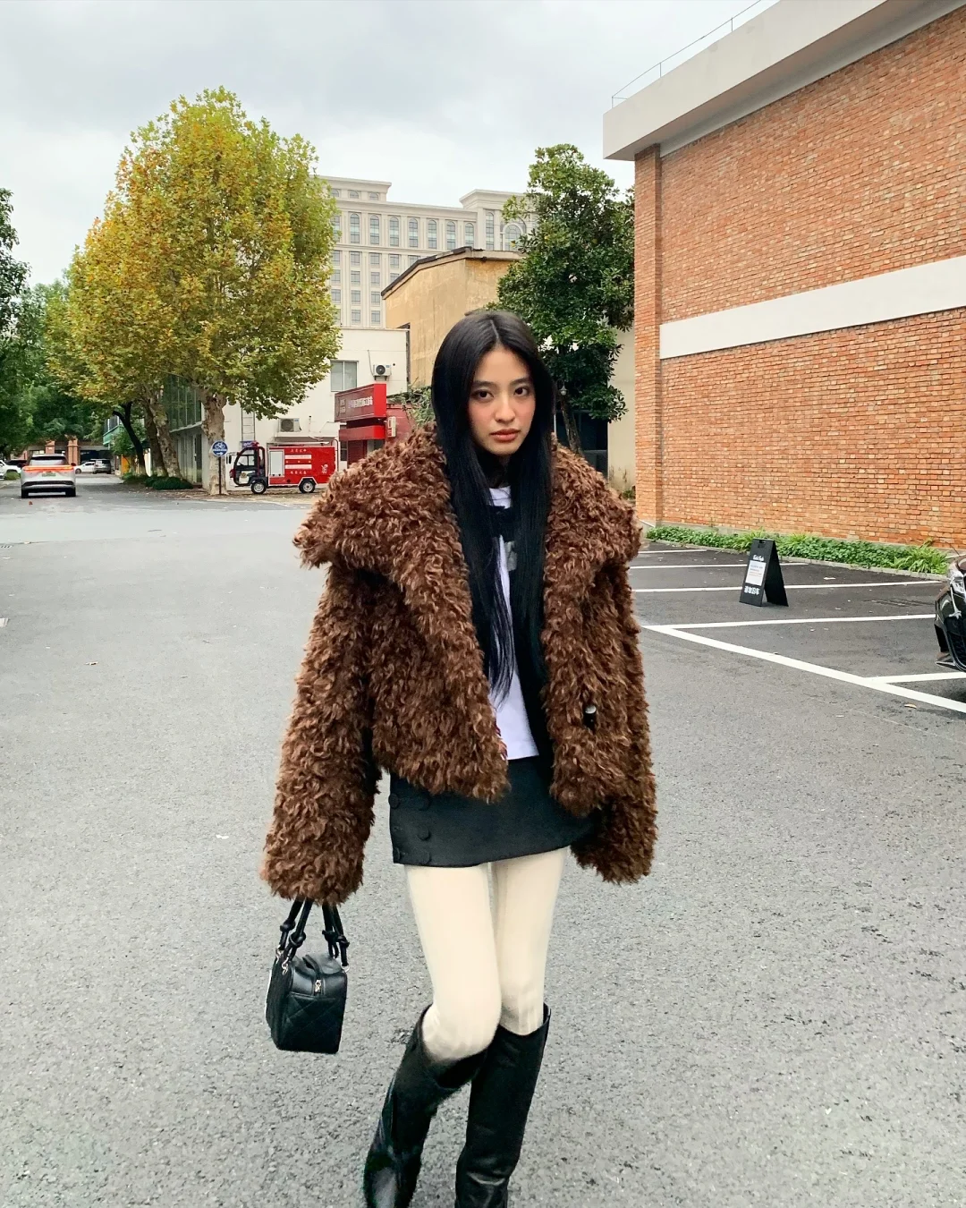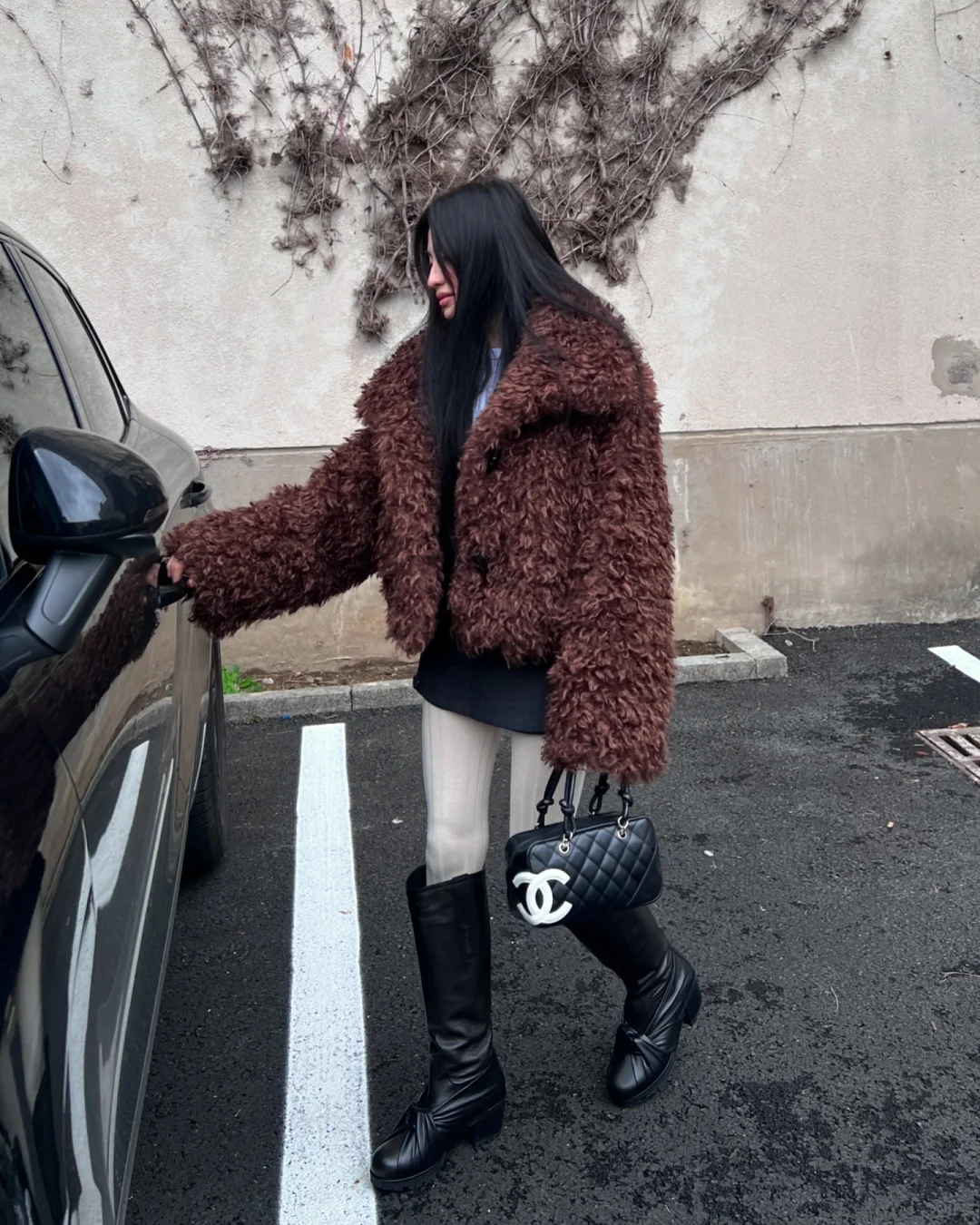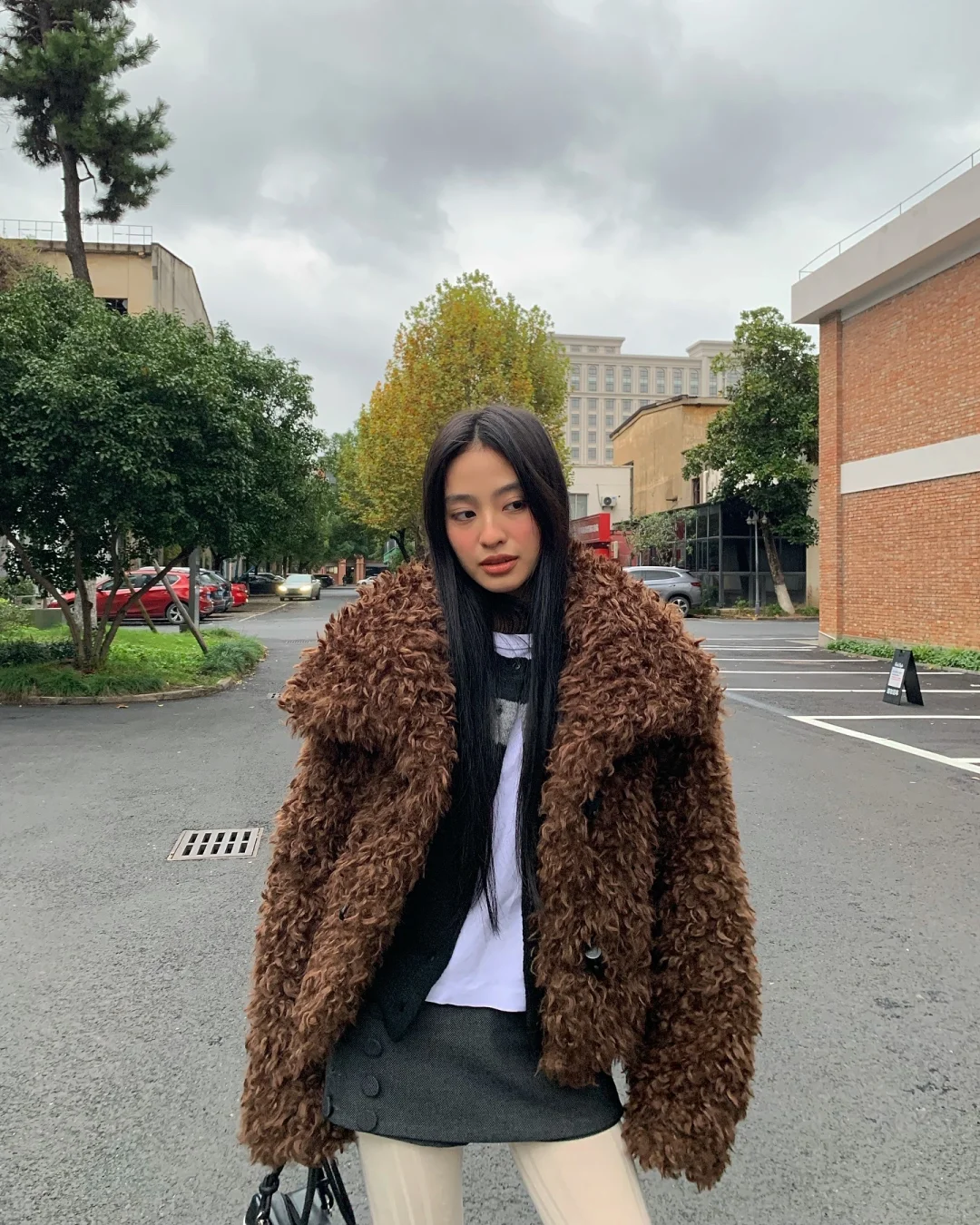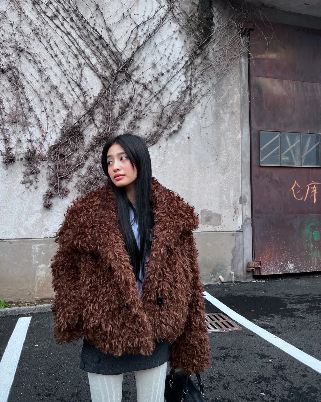 谢谢分享RARELY ALIKE翻领牛角扣环保皮草外套