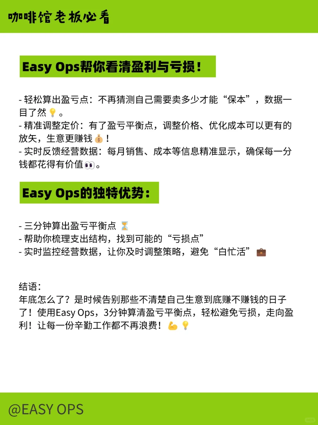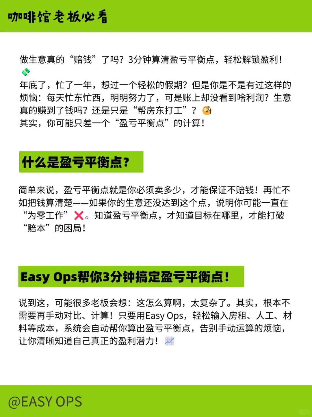 年底怎么了?是时候告别那些不清楚自己生意到底赚不赚钱的日子了!使用Easy Ops,3分钟算清盈亏平衡点,轻松避免亏损,走向盈利!让每一份辛勤工作都不再浪费!