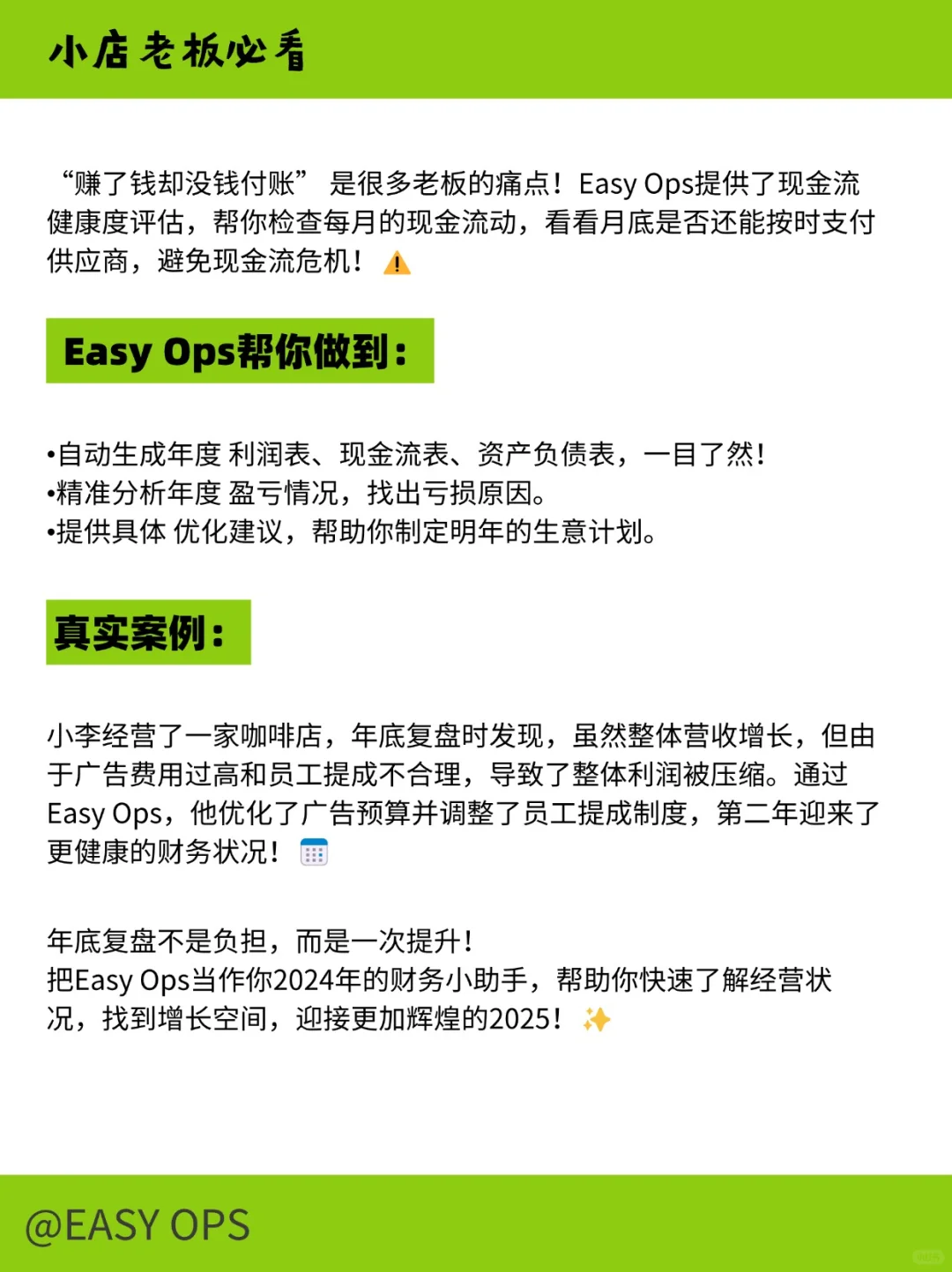 把Easy Ops当作你2024年的财务小助手,帮助你快速了解经营状况,找到增长空间,迎接更加辉煌的2025!