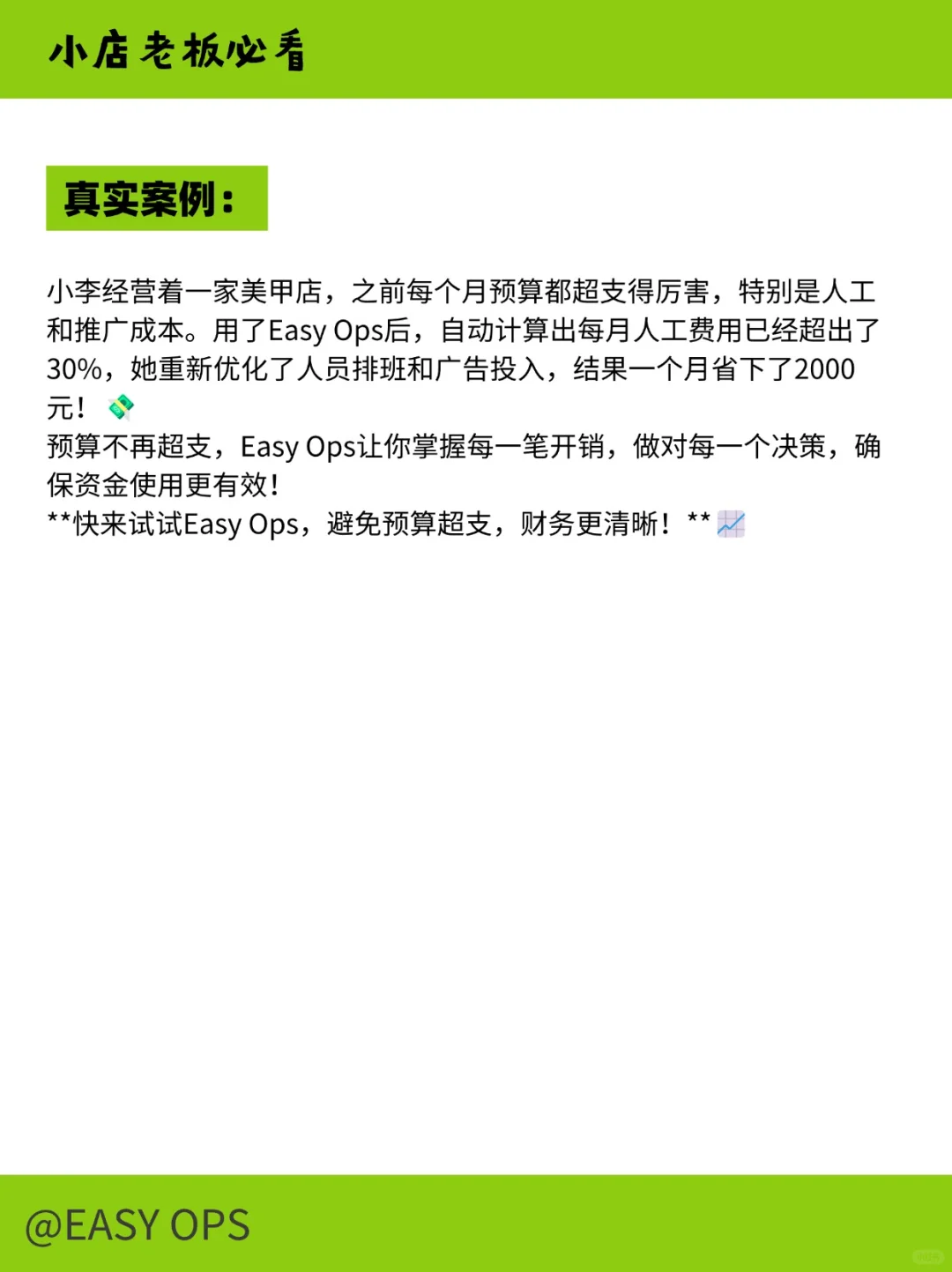 小李经营着一家美甲店,之前每个月预算都超支得厉害,特别是人工和推广成本。用了Easy Ops后,自动计算出每月人工费用已经超出了30%,她重新优化了人员排班和广告投入,结果一个月省下了2000 元!