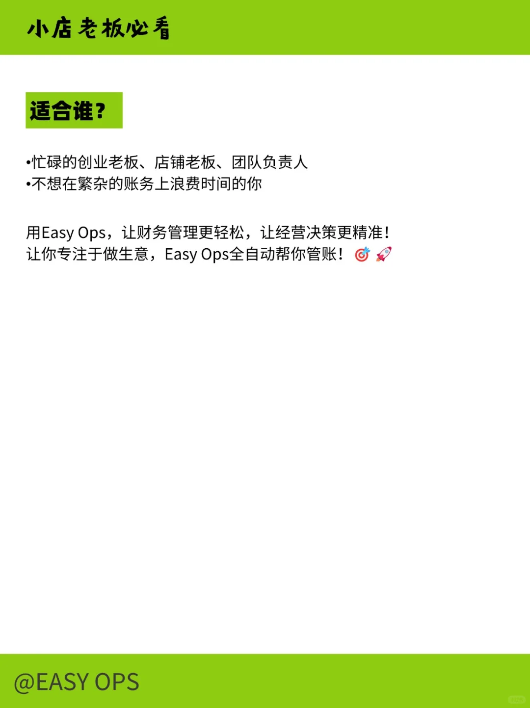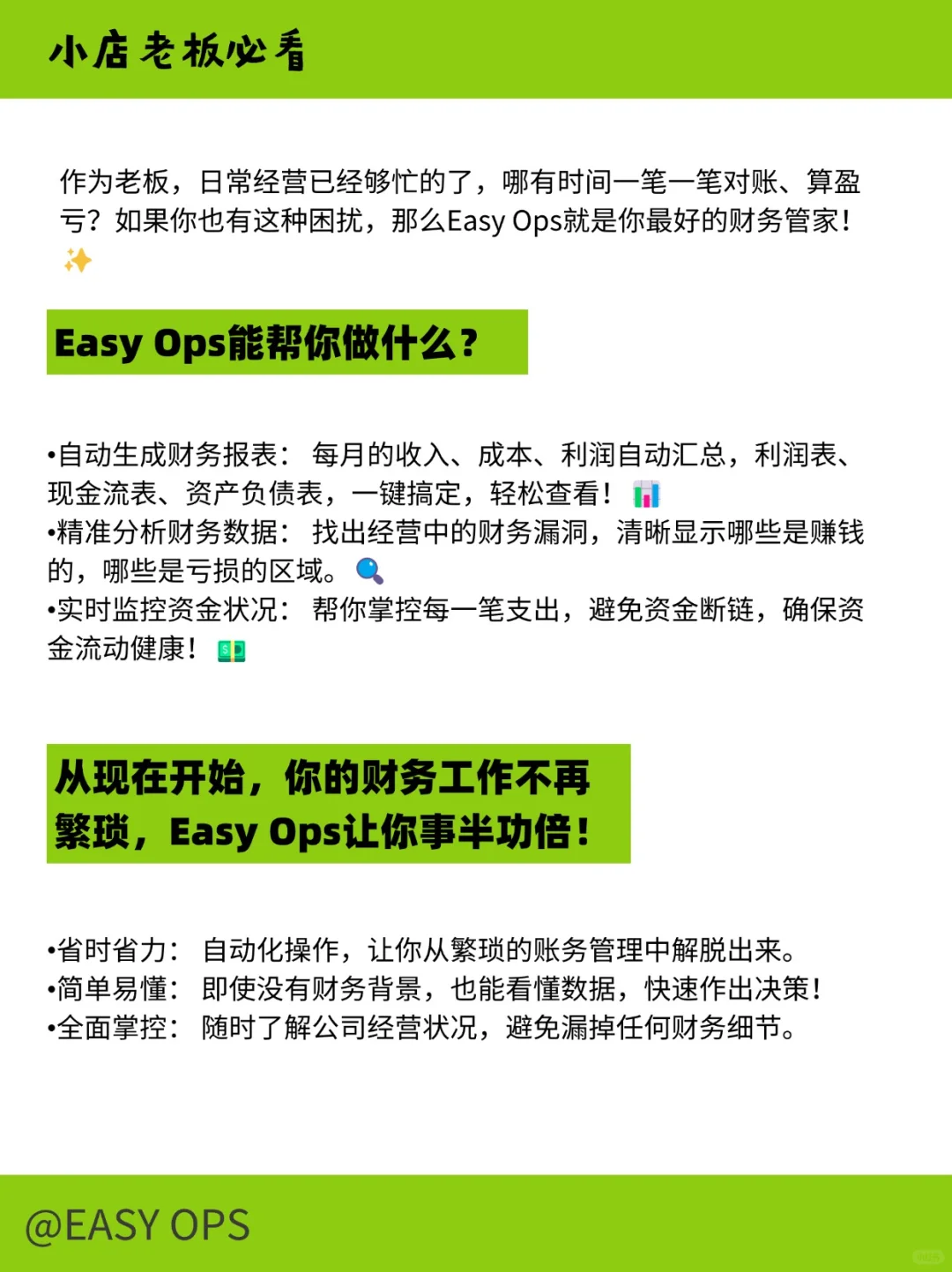 用Easy Ops,让财务管理更轻松,让经营决策更精准! 让你专注于做生意,Easy Ops全自动帮你管账!