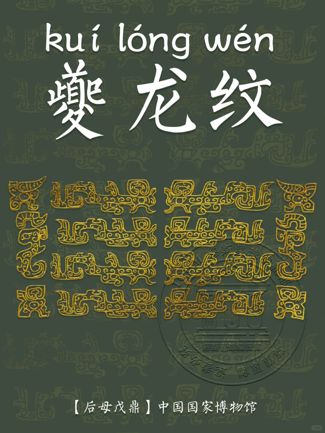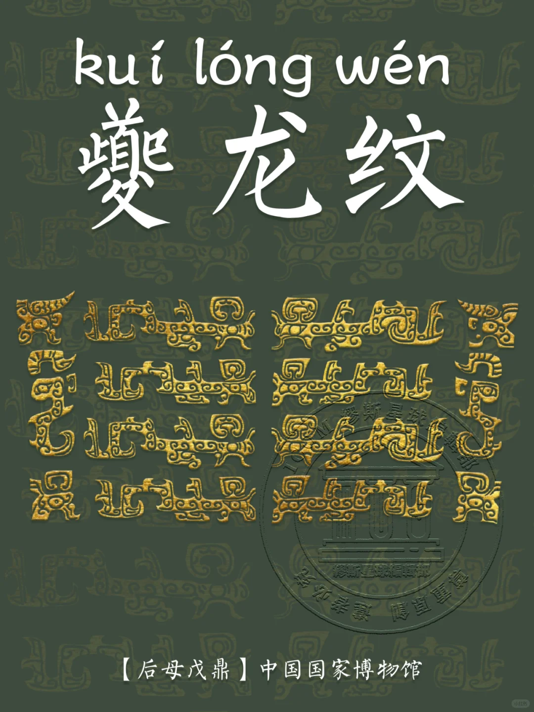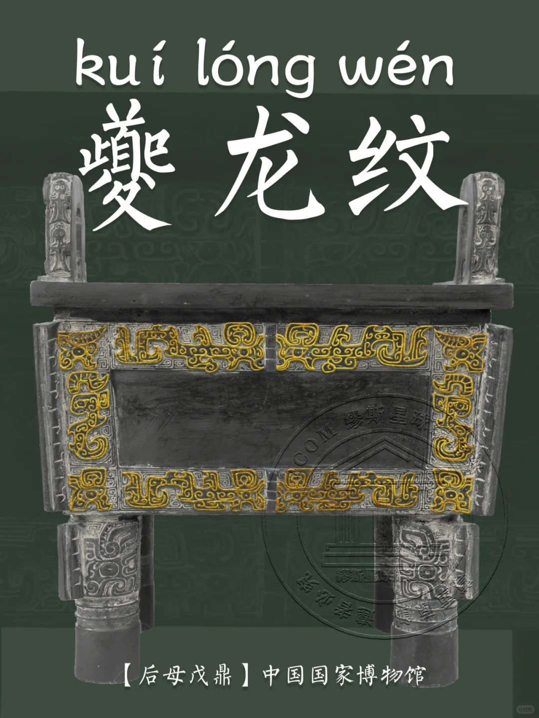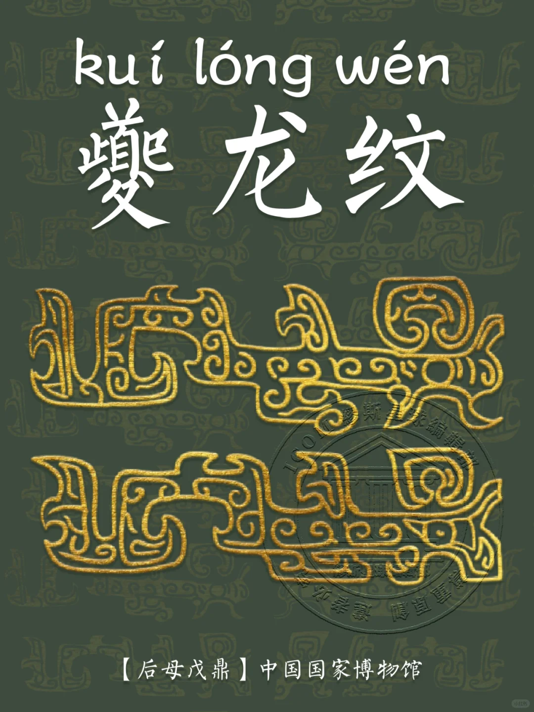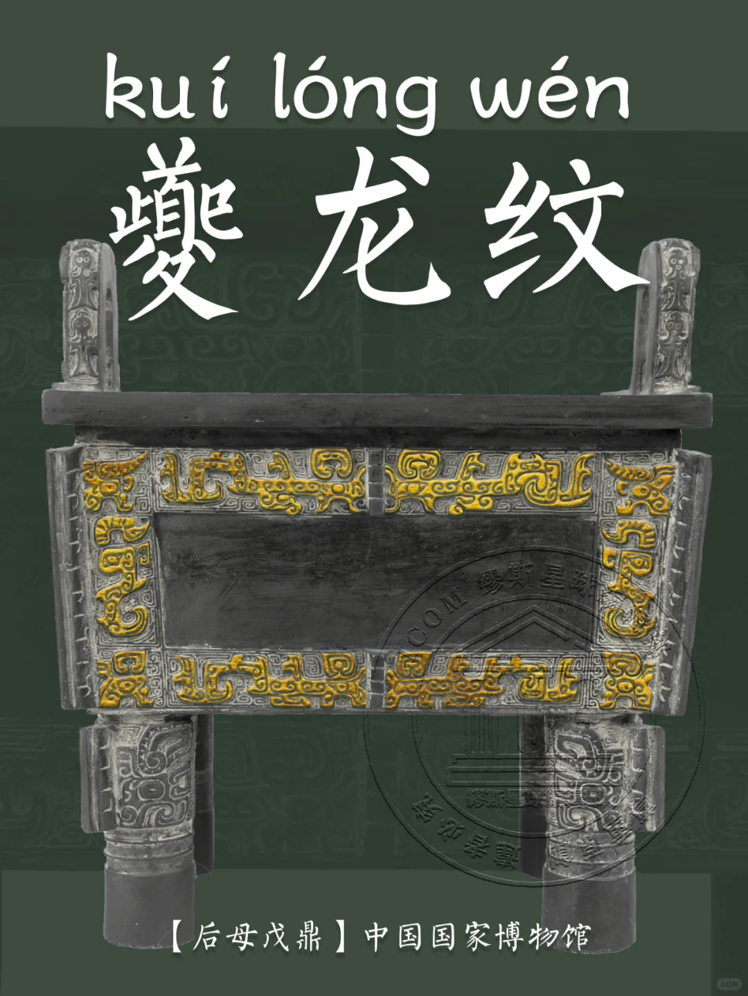 📍 夔龙纹的基本特征是:夔龙的外形为 “一角、一足、张口、尾上卷”,是侧身形象的描绘。夔龙纹的寓意丰富,一方面意在祈求风调雨顺,另一方面也有驱邪避魔的寓意。