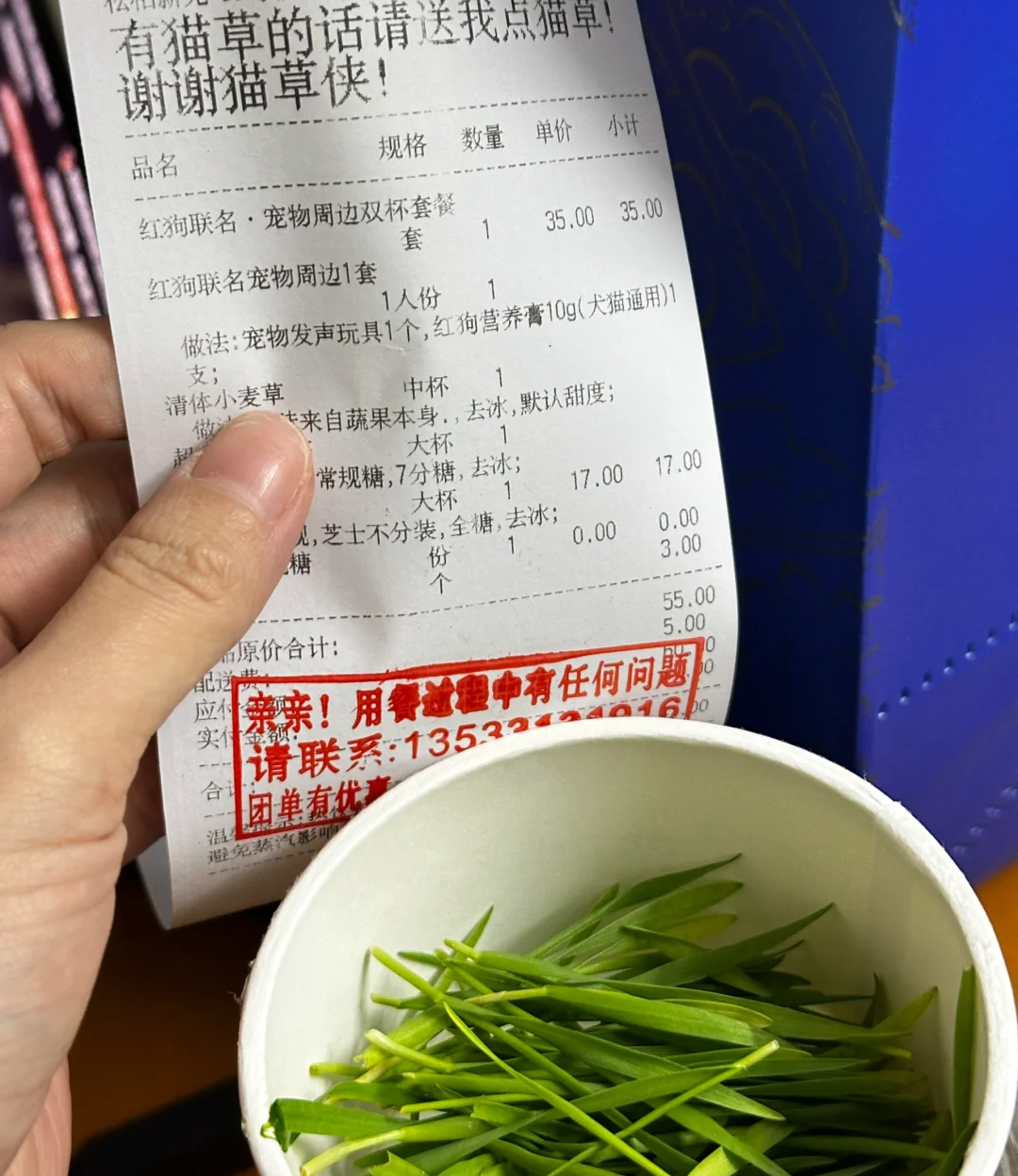 茶百道的猫草汁➕猫草也是拿到手了 但是买的套餐玩具跟营养膏漏送了呜呜呜,店员打电话来说下次给我补送,行吧看在猫草侠这么大方的份上我改天再点一次吧 还别说,味道像羽衣甘蓝那类型的蔬果汁