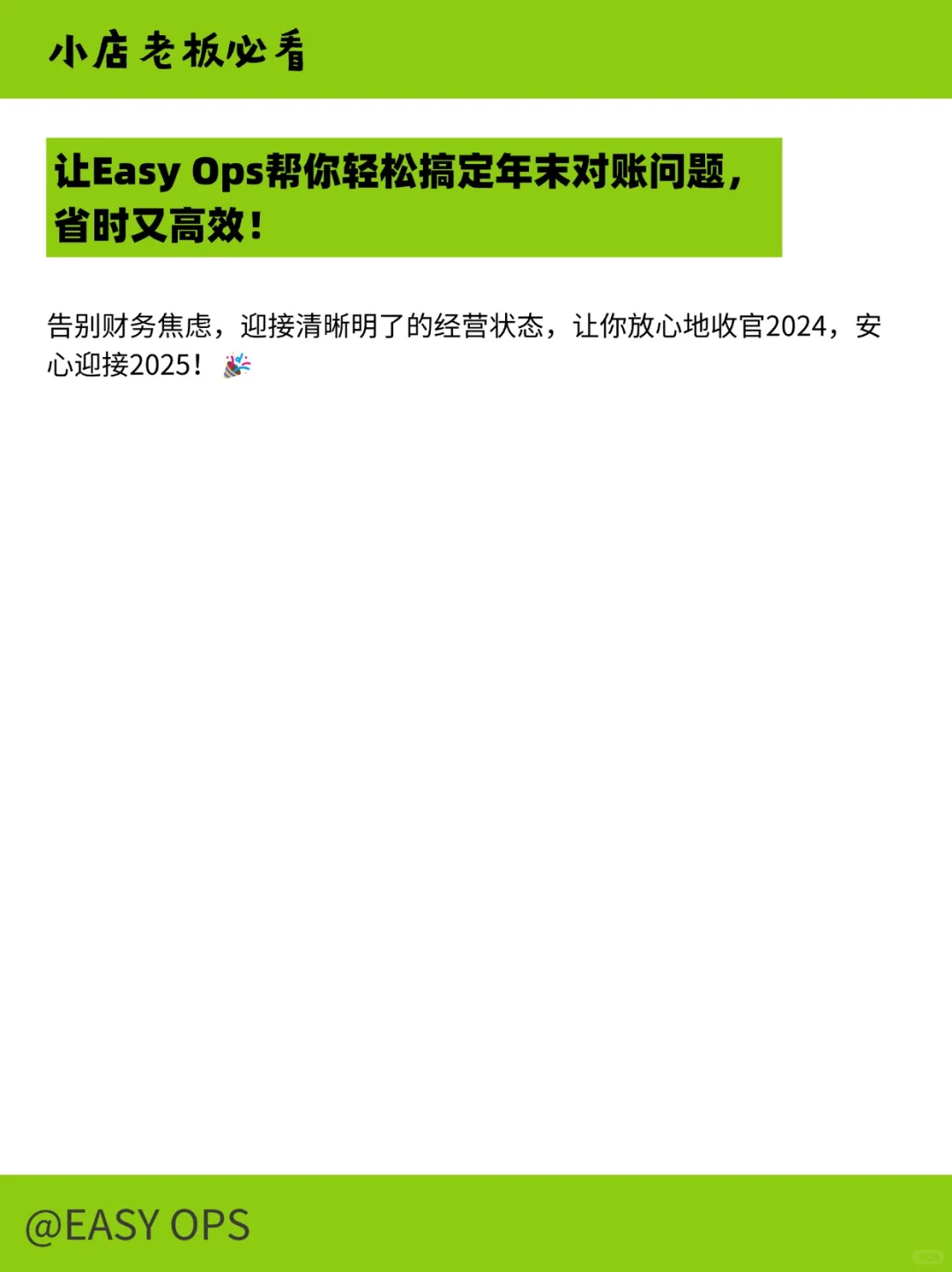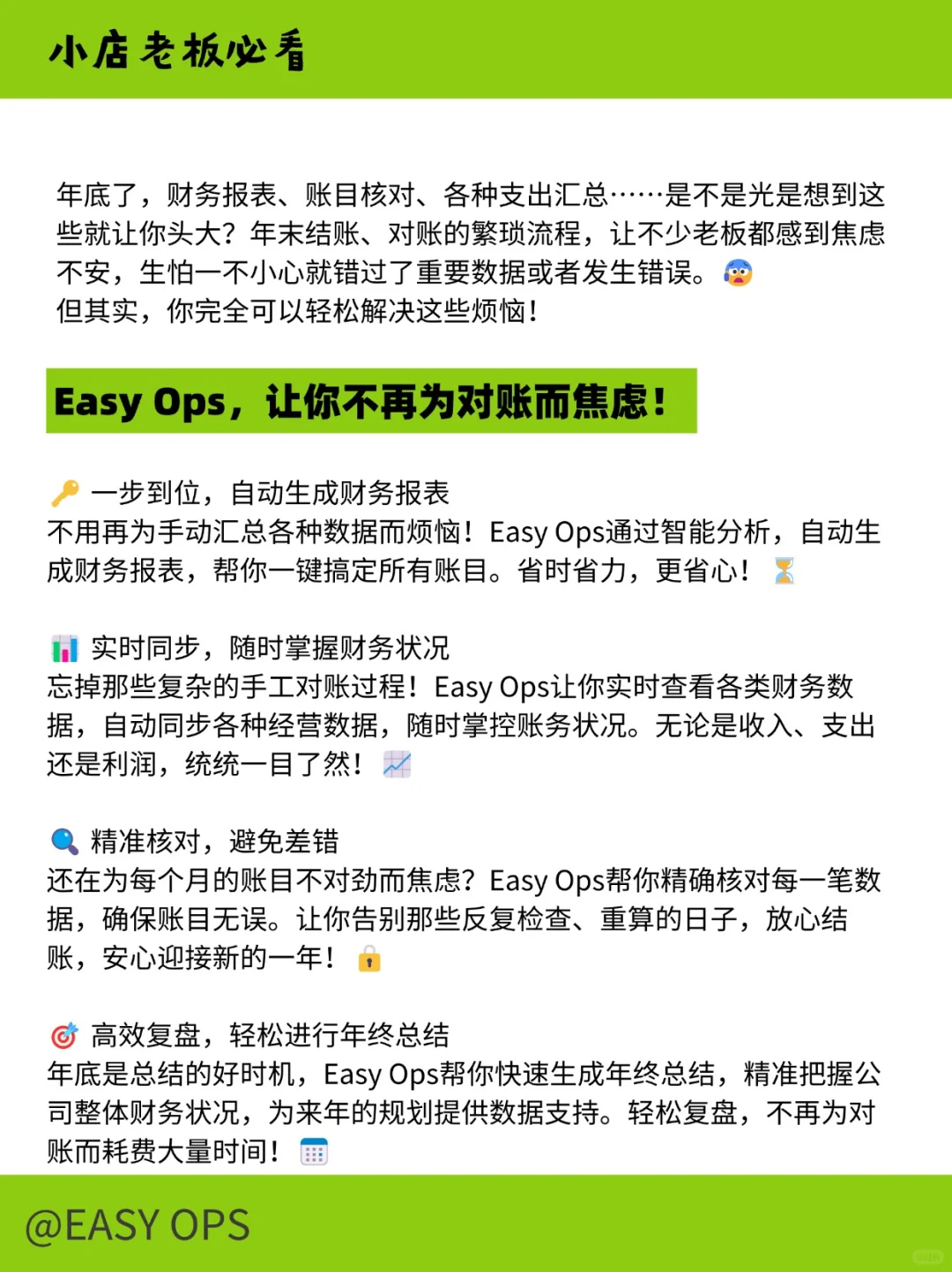 还在为每个月的账目不对劲而焦虑?Easy Ops帮你精确核对每一笔数据,确保账目无误。让你告别那些反复检查、重算的日子,放心结账,安心迎接新的一年!