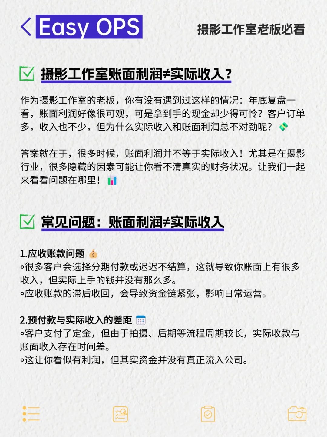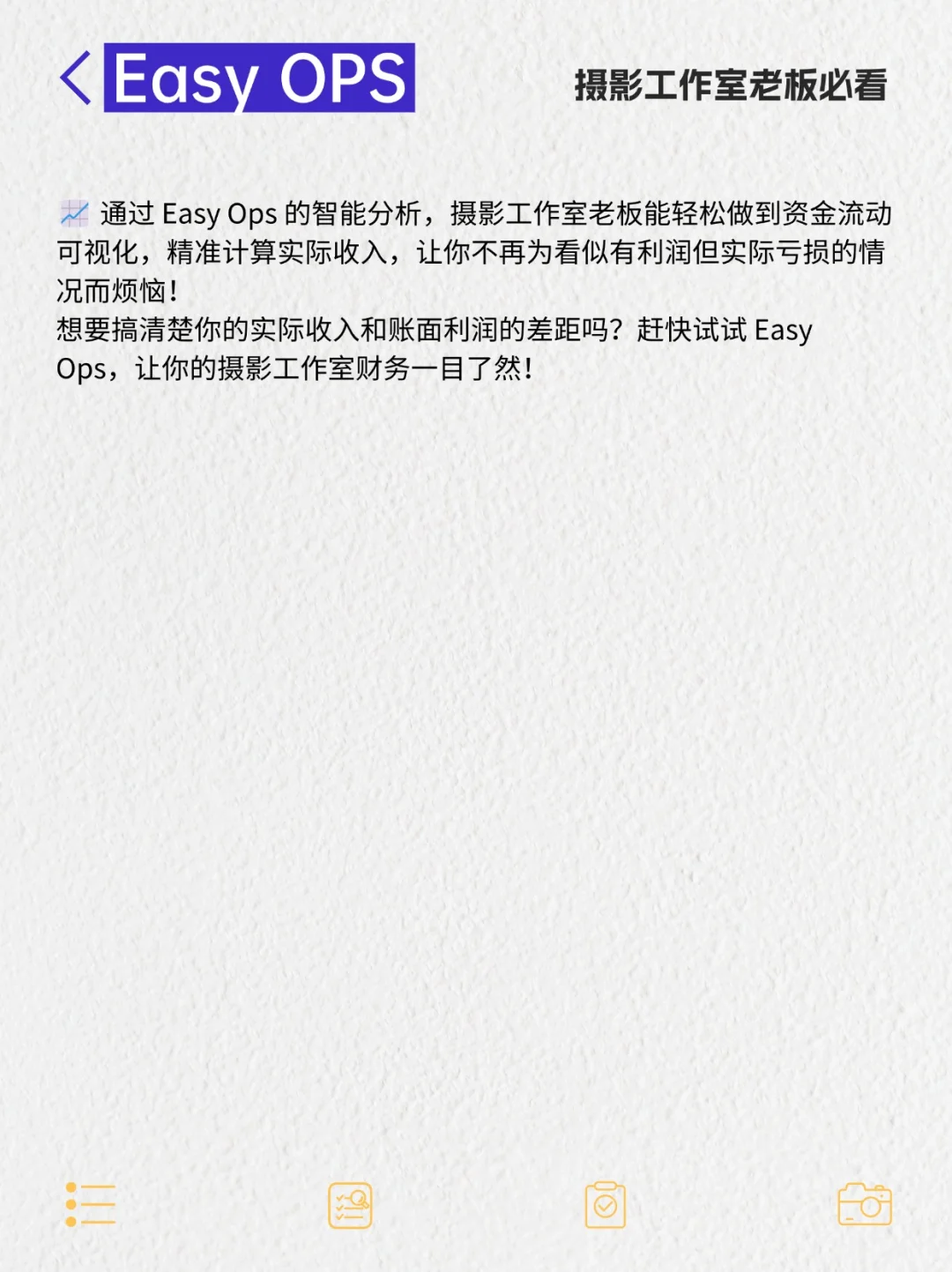 想要搞清楚你的实际收入和账面利润的差距吗?赶快试试Easy Ops, 让你的摄影工作室财务一目了然!