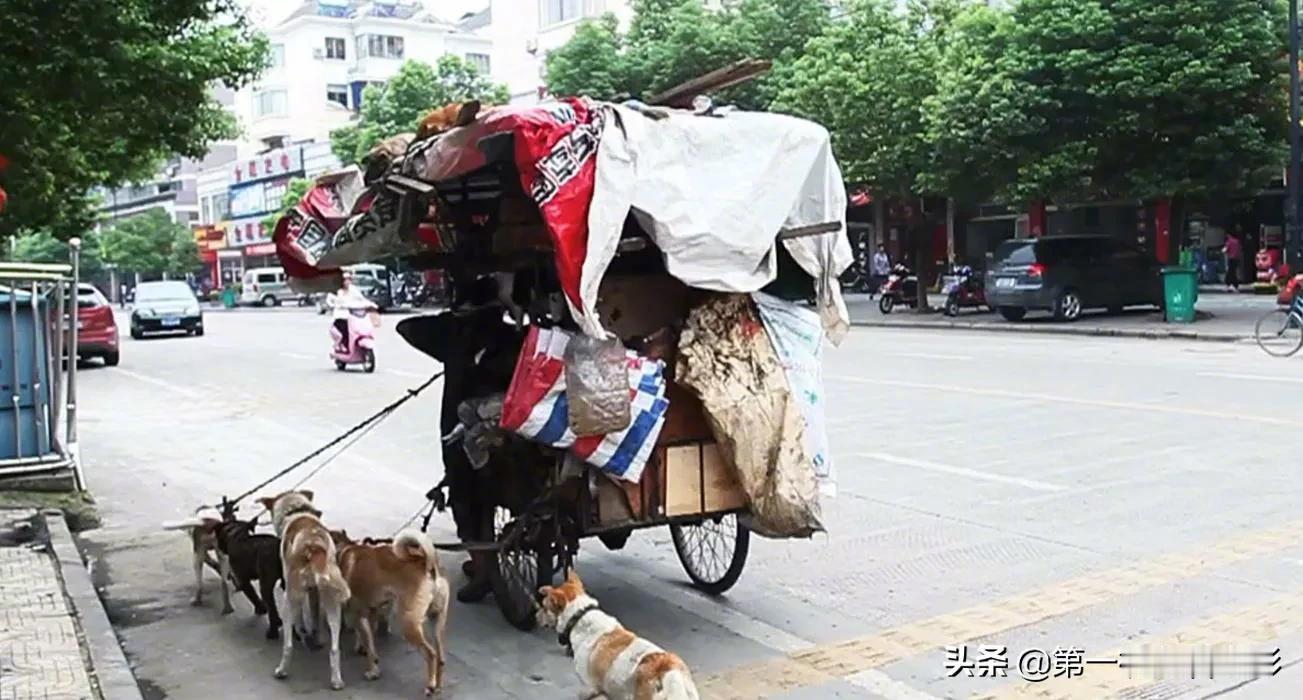 83岁拾荒老人收养了13条狗狗,带着狗狗一起漂泊流浪。