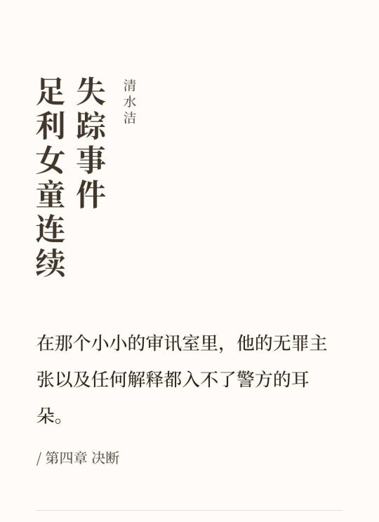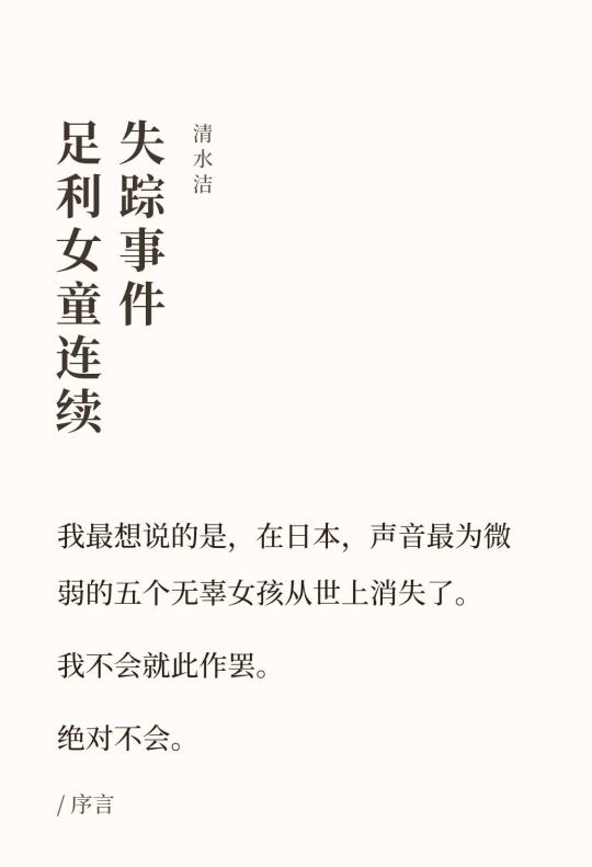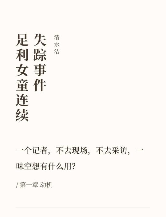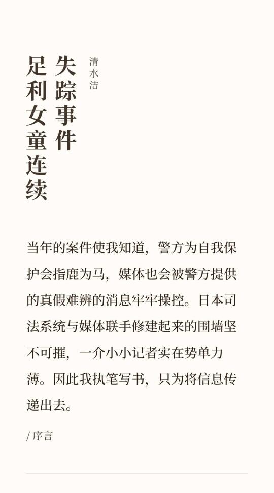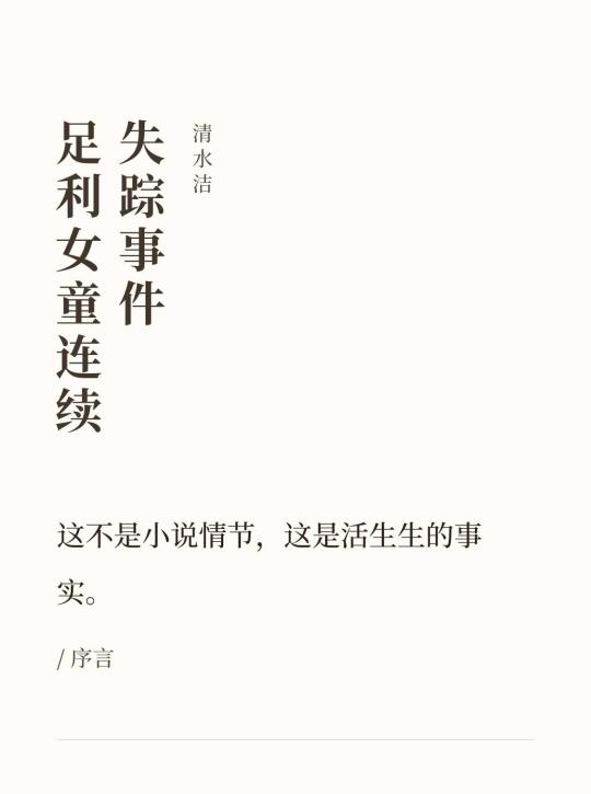 《足利女童连续失踪事件》是清水洁在《桶川跟踪 狂杀 人事件》之后出的一本纪实案件。