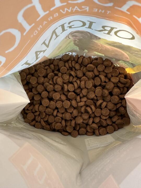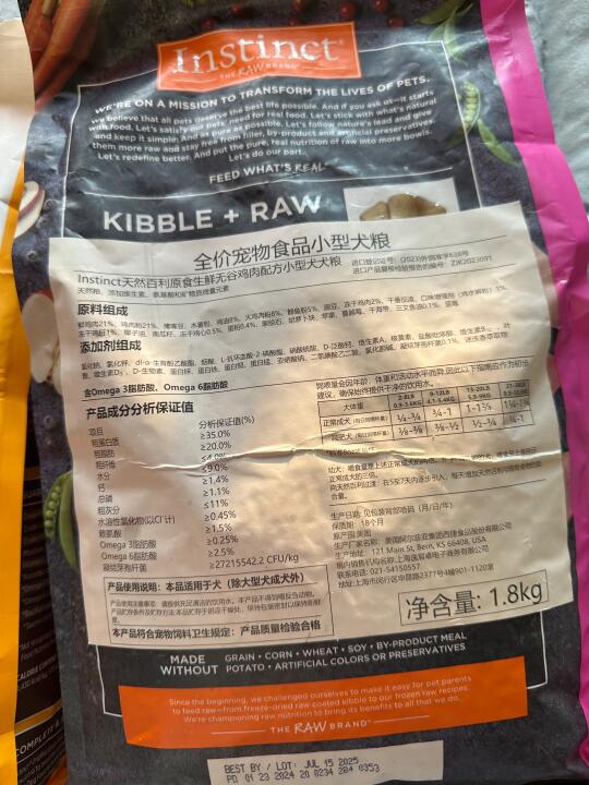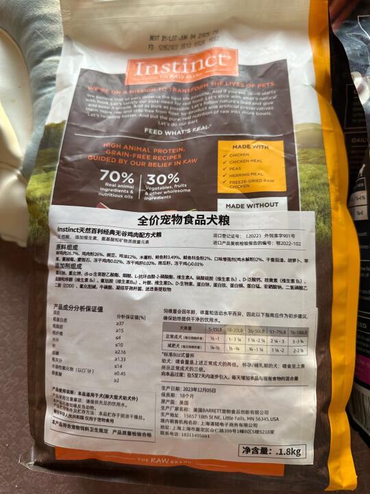 这款是百利他们家狗粮里面,性价比算是最高的一款把,跟狗车的话,一斤才20出头一点,对钱包很友好,颗粒表面也有冻干涂层包裹,适口性也很好,我家狗狗也很喜欢吃!肉源用的跟小型犬一样,都是北美散养的走地鸡,70%的含肉量及动物油脂,30%的果蔬,营养搭配也不错,粗蛋白做到了37%,是无谷配方的,还加了8000w益生菌,对狗狗肠胃特别好,我家狗子吃这款,拉的粑粑永远都是完美的,捡屎超轻松dei~(*^▽^*)