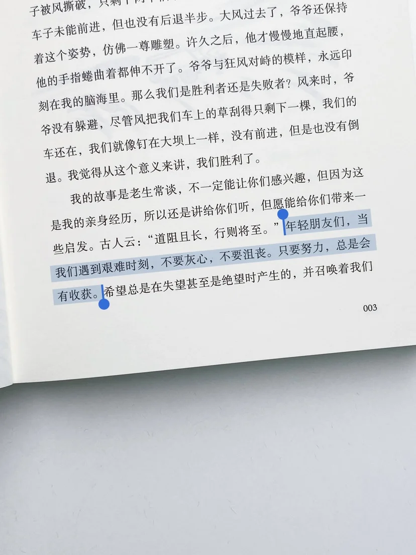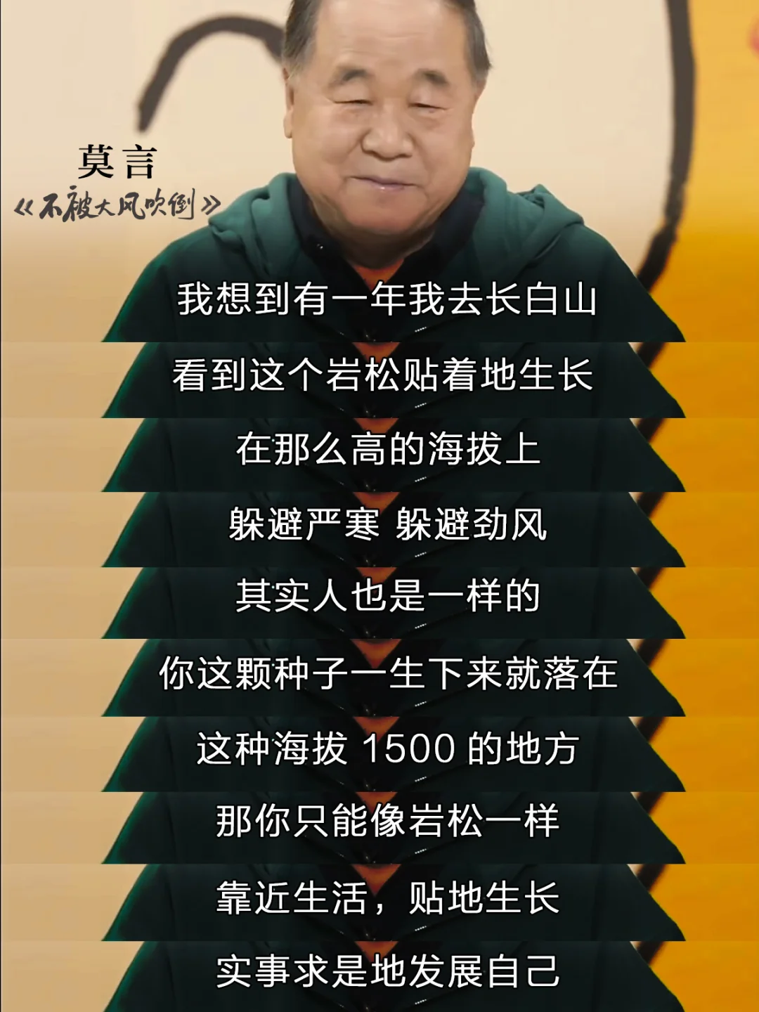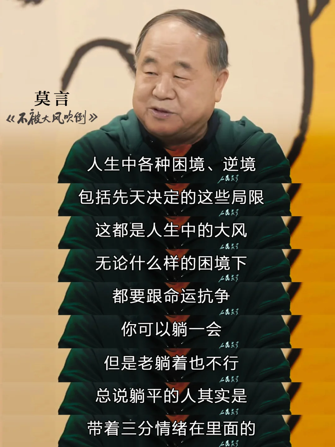 内容很丰富,又很轻松,两三个小时就能读完,而且非常治愈,就像是在和莫言老师坐着聊天,他笑眯眯地讲了很多故事,分享很多人生感悟,然后拍了拍我的肩膀说:风起时,不被大风吹倒,也是一种前进。