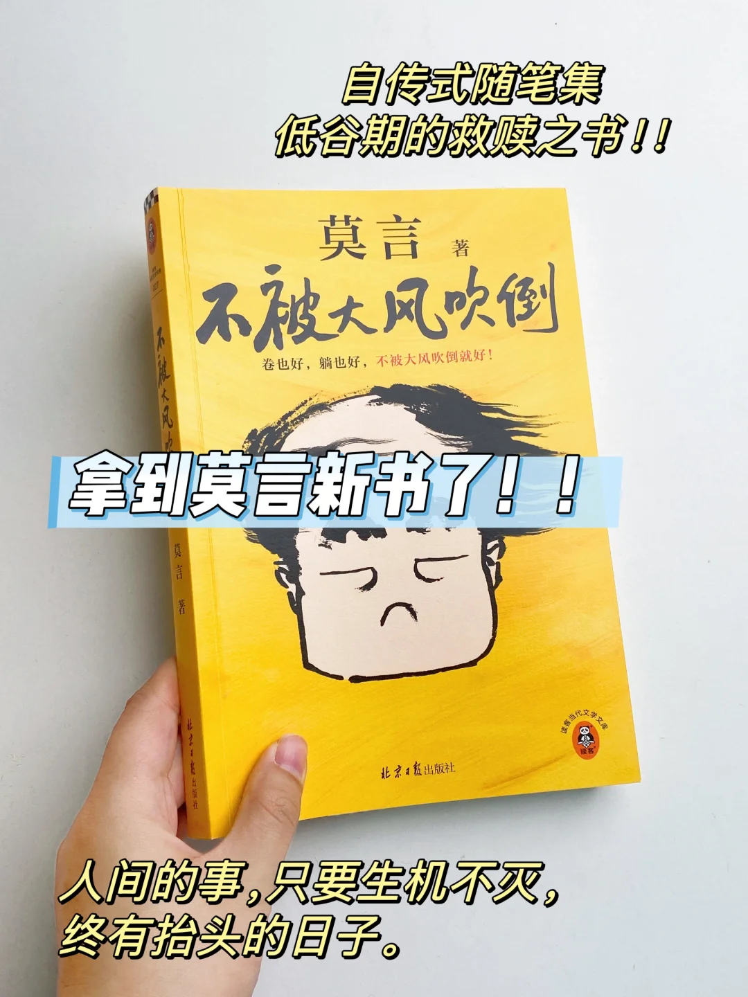 莫言老师的新书《不被大风吹倒》,又有趣又治愈,充满了平和而温暖的力量。这本书是他的自传式杂文集,分享了很多他的亲身经历,包括和余华史铁生的友情故事。还有他的人生态度,读书和写作心得……