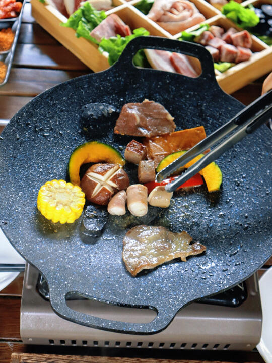 晚餐我们点了自助烤肉,有荤有素,新鲜的五花肉滋滋冒油,嘎嘎香!大小盆友们吃得开心又满足。