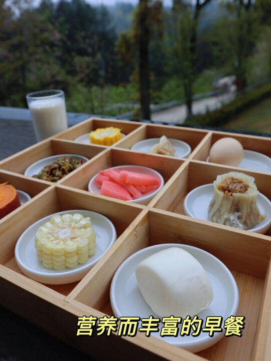早餐种类丰富,面包、鸡蛋、牛奶、水果,营养均衡又充满仪式感。