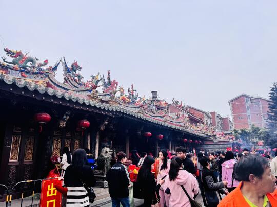 香火极旺的民间信仰中心,供奉关羽与岳飞,闽南建筑装饰繁复华丽,楹联“诡诈奸刁,到庙倾诚何益”发人深省。