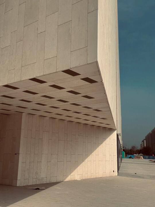 外立面采用天然洞石,温润如玉呼应良渚文化;顶部玻璃幕墙与稻田景观融合,随手一拍就是大片。