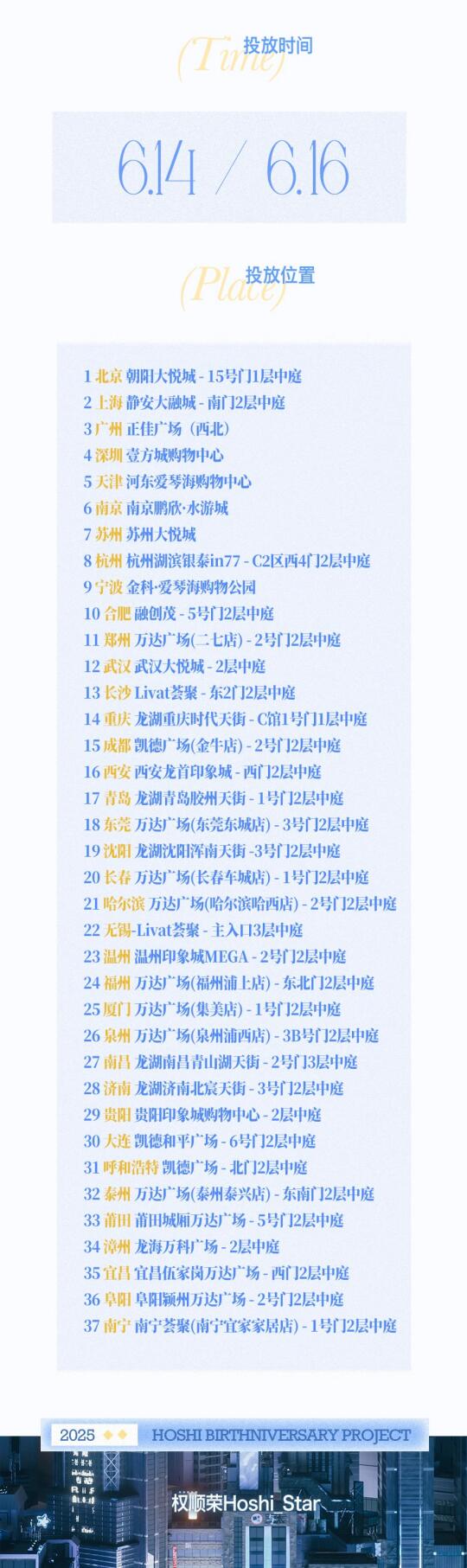 荣吧希望能够尽可能的广泛覆盖国内区域,让每位中国粉丝在自己的城市抬头一看,便可与顺荣的生日同频共振。
