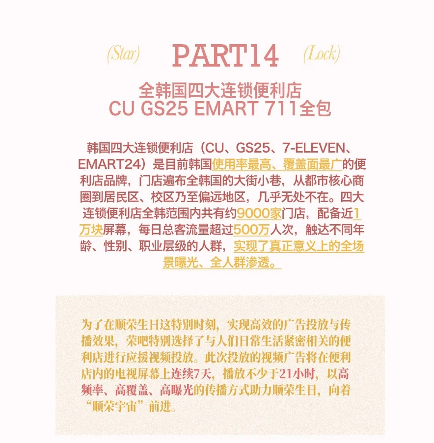 为了在顺荣生日这特别时刻,实现高效的广告投放与传播效果,荣吧特别选择了与人们日常生活紧密相关的便利店进行应援视频投放。此次投放的视频广告将在便利店内的电视屏幕上连续𝟳天,播放不少于𝟮𝟭小时,以高频率、高覆盖、高曝光的传播方式助力顺荣生日,向着“顺荣宇宙”前进。