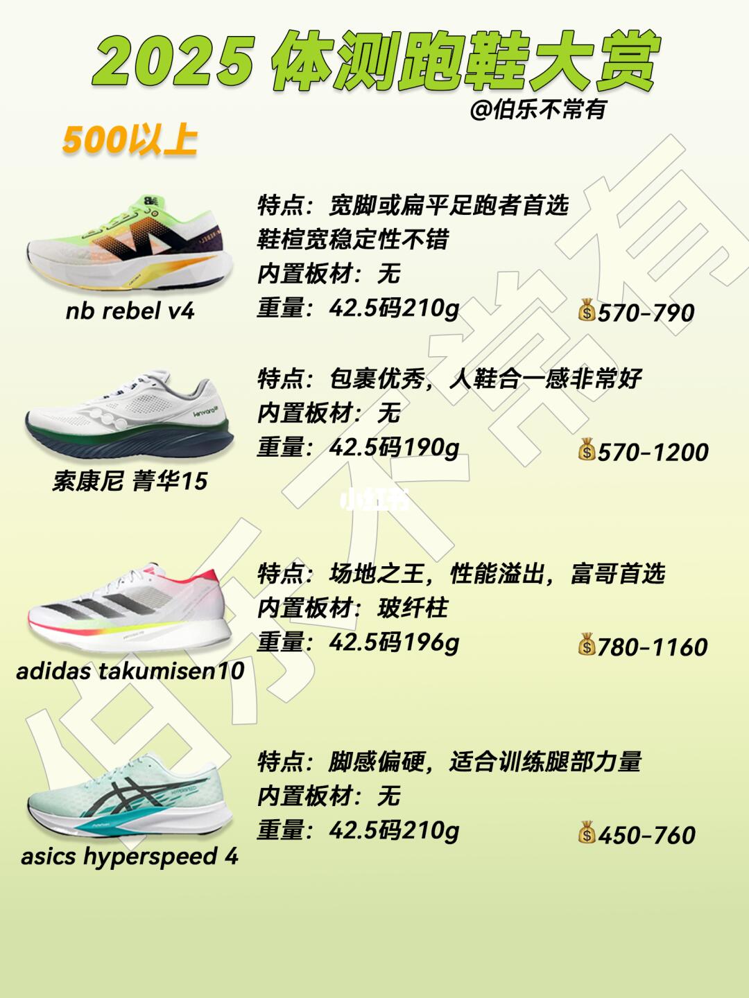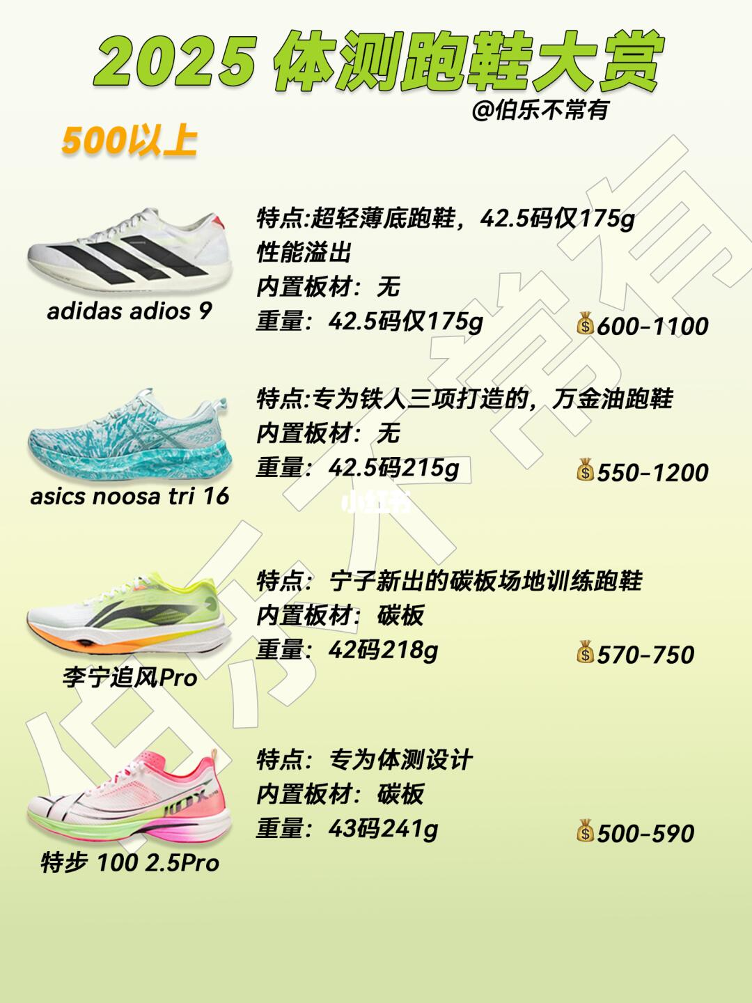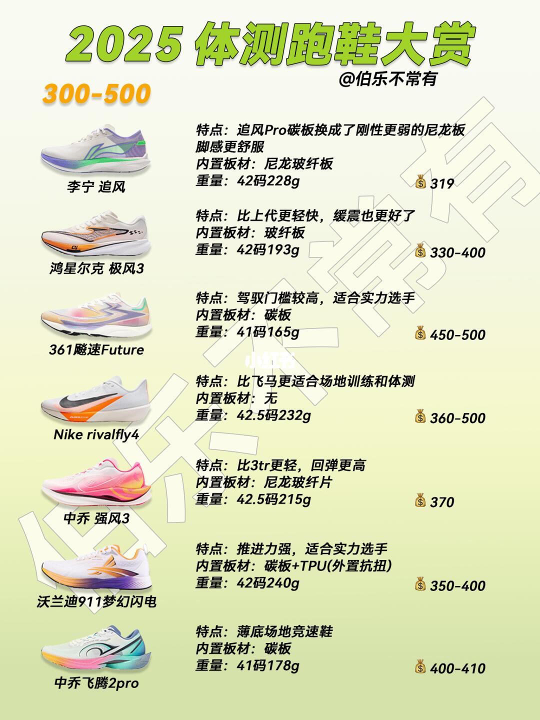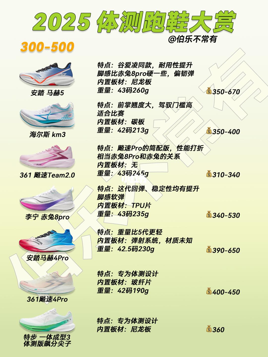 每双鞋后面都标好了入手区间、重量、内置板材,大家根据自己的训练习惯选哈~