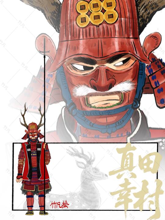 [一R]真田幸村(1567-1615),日本战国时代名将,被誉为"日本第一兵"。真田昌幸次子,擅长谋略与游击战。在大坂之役中率赤备队屡破德川军,因寡不敌众最终战死。其"六文钱"家纹和"真田十勇士"的传说广为人知,成为武士精神的象征。 [二R]甲胄以赤色最为明显,盔体竖起两根巨型鹿角作为装饰,立物为六文钱家徽,胸部用了二枚胴结构。使用武器为十文字枪也是很具有代表性的长枪武器。