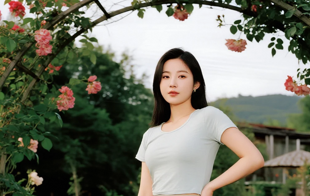 她在花海中的姿态,透露出一种难以言喻的魅力