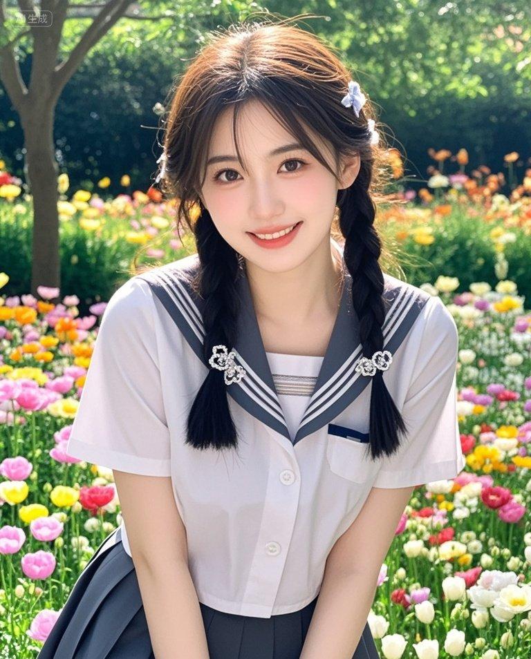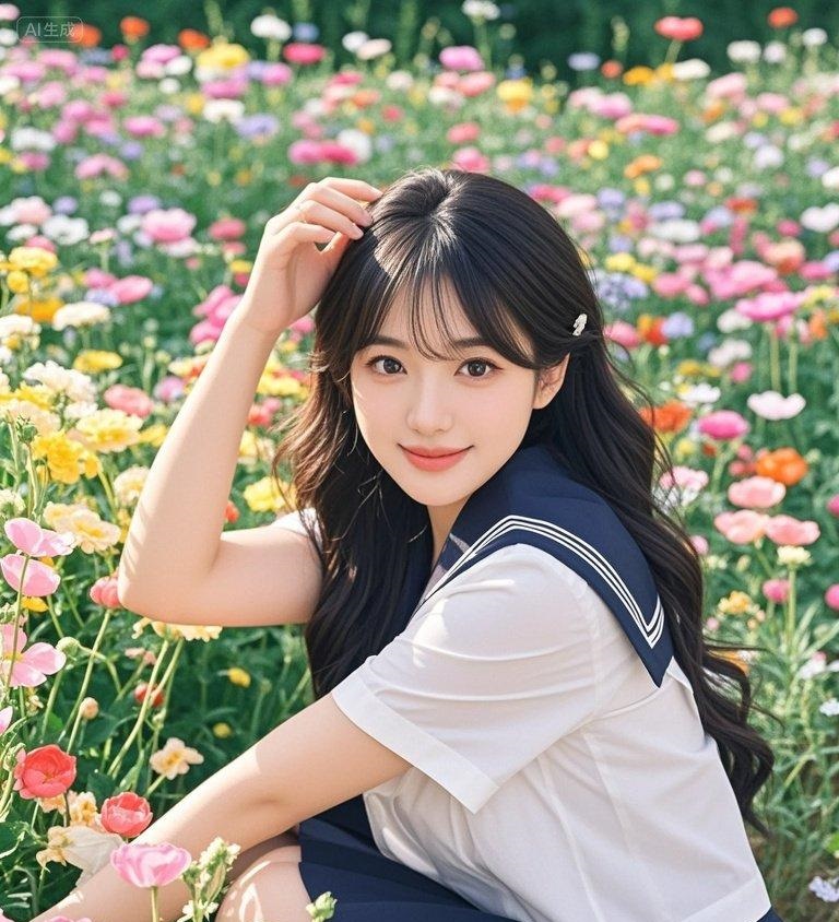她在花海中的姿态,透露出一种难以言喻的魅力