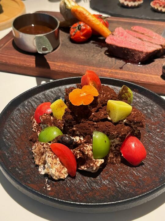 【菲力牛排五分熟】🥩感觉不像五分熟,甚至比七分还多,对于牛排来说有点一般,反倒是配菜西红柿一口爆汁很好吃😋