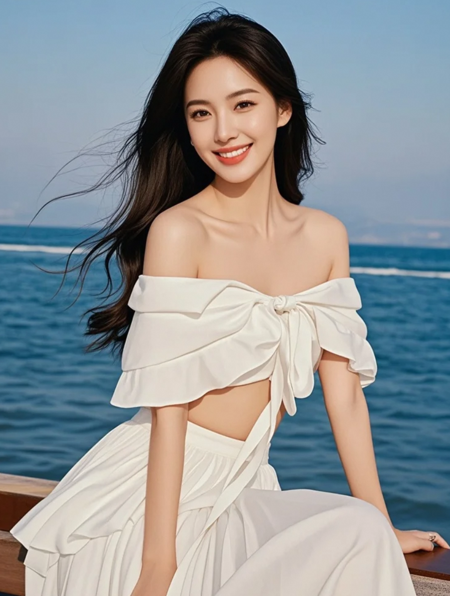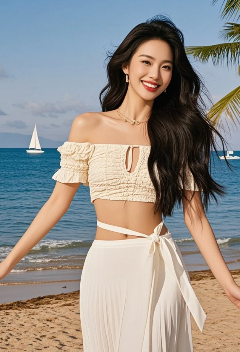 她在海边拍照,每一帧都是大片