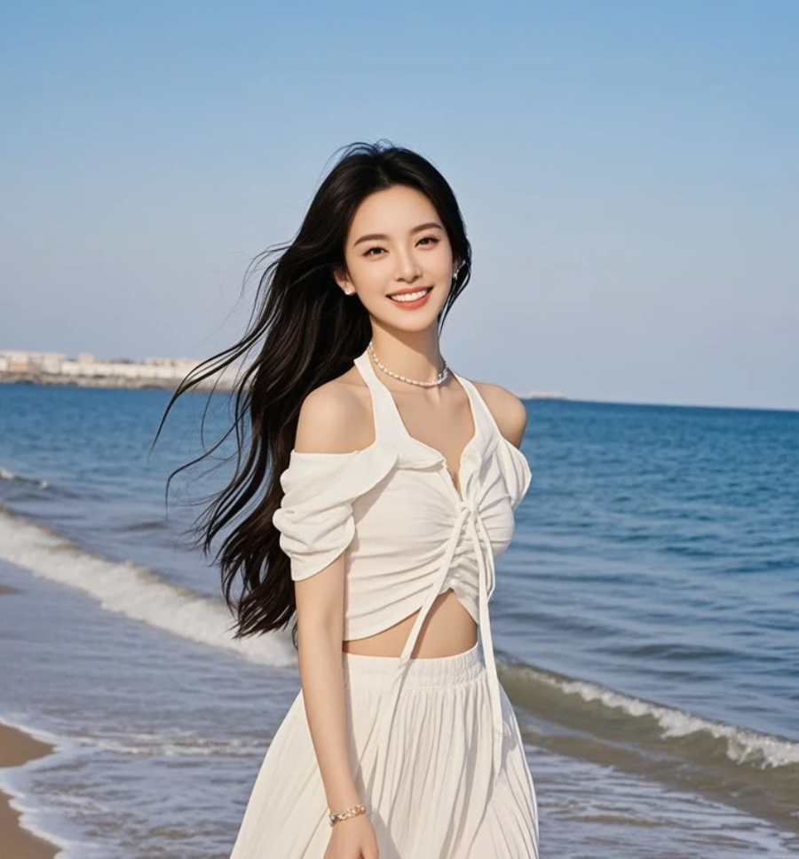 她穿着白裙在海边,拍出夏日氛围感