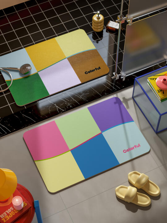 地垫采用几何拼色设计 高饱和色块与波浪线条的组合 营造出丰富的视觉层次 中古风格的配色既时髦又耐看 能为浴室空间增添一抹 恰到好处的色彩亮点 -