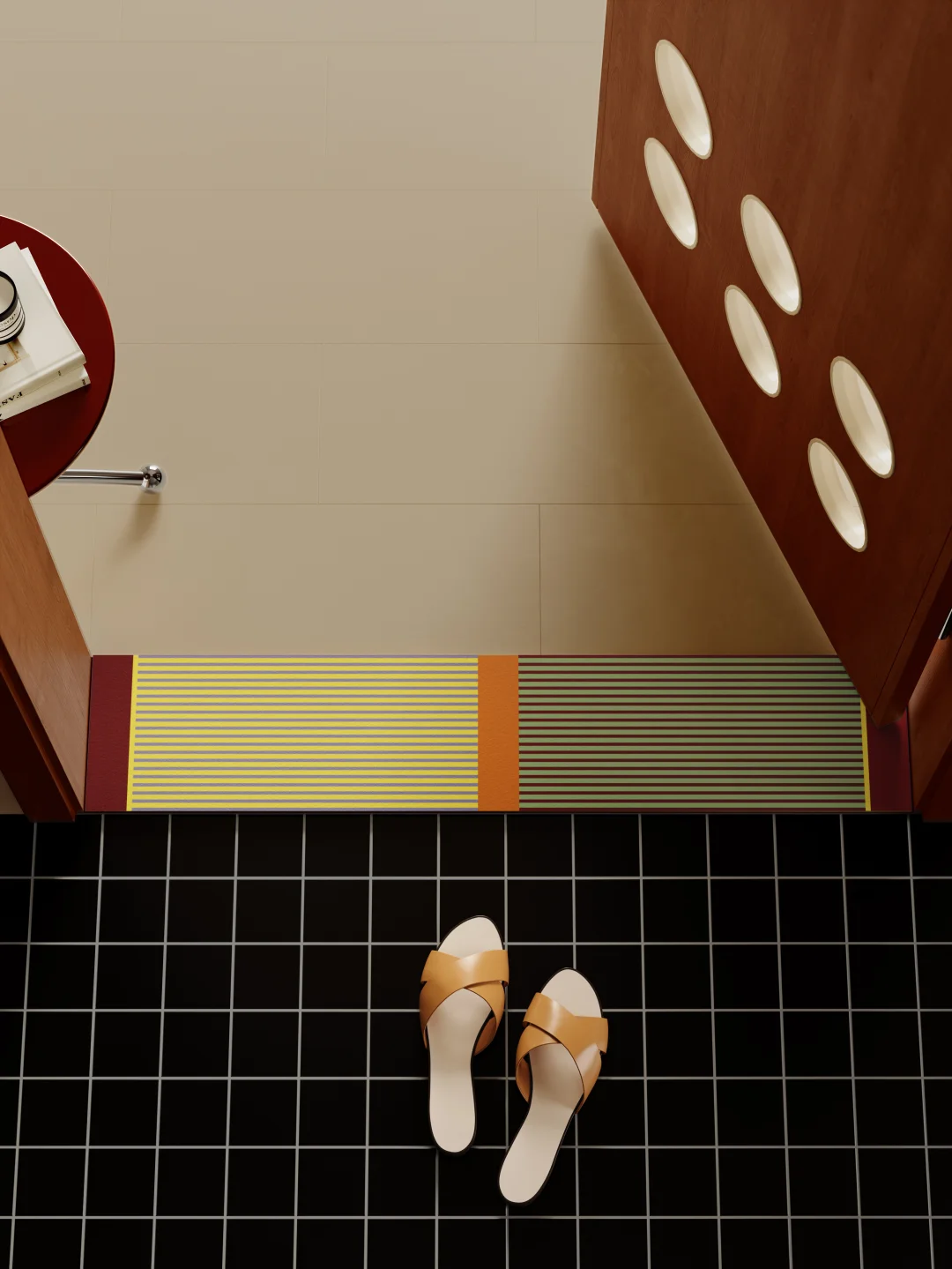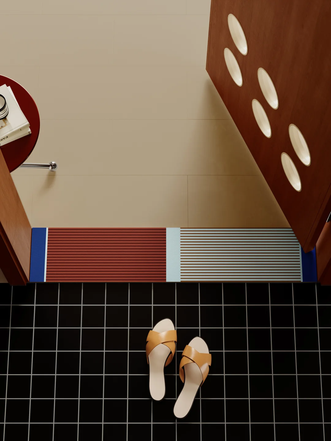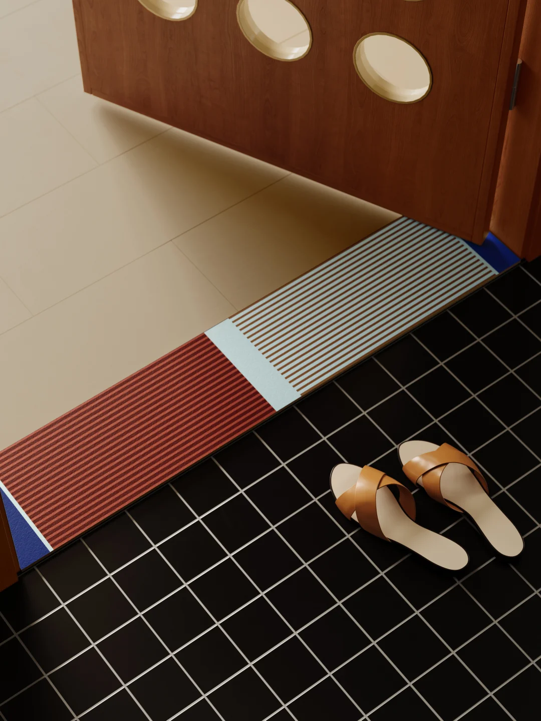 吸水防滑的科技皮材质 刚好遮住门槛石色差和磨损 细条纹叠加中古撞色设计 低饱和粉绿棕的搭配不突兀 适合放在玄关或厨房过渡区 日常打理用湿布擦就可以 简单铺贴就能让门口变亮眼 比换瓷砖省心很多! -