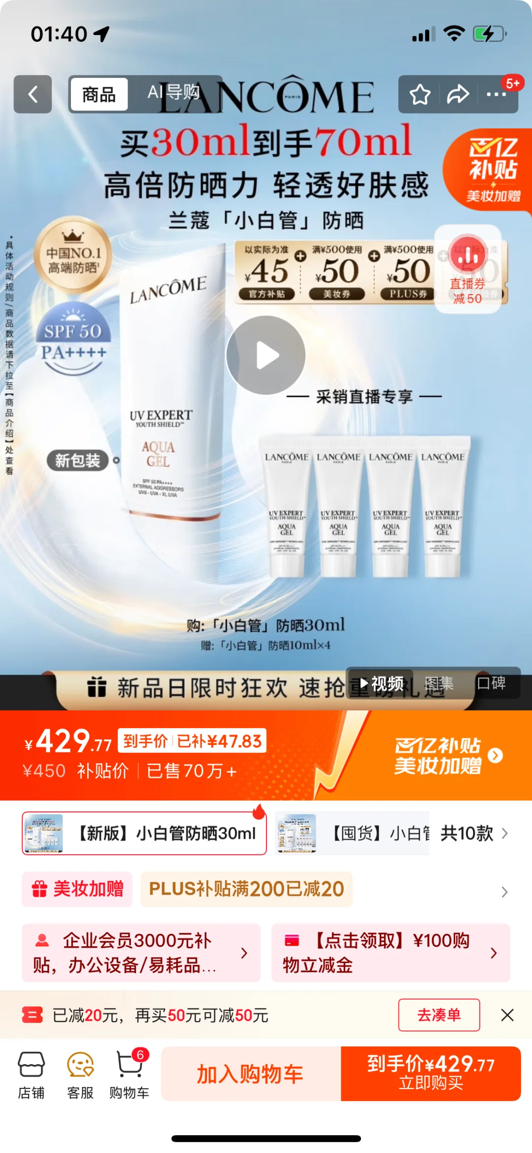 320➗兰蔻小白管防晒70ml