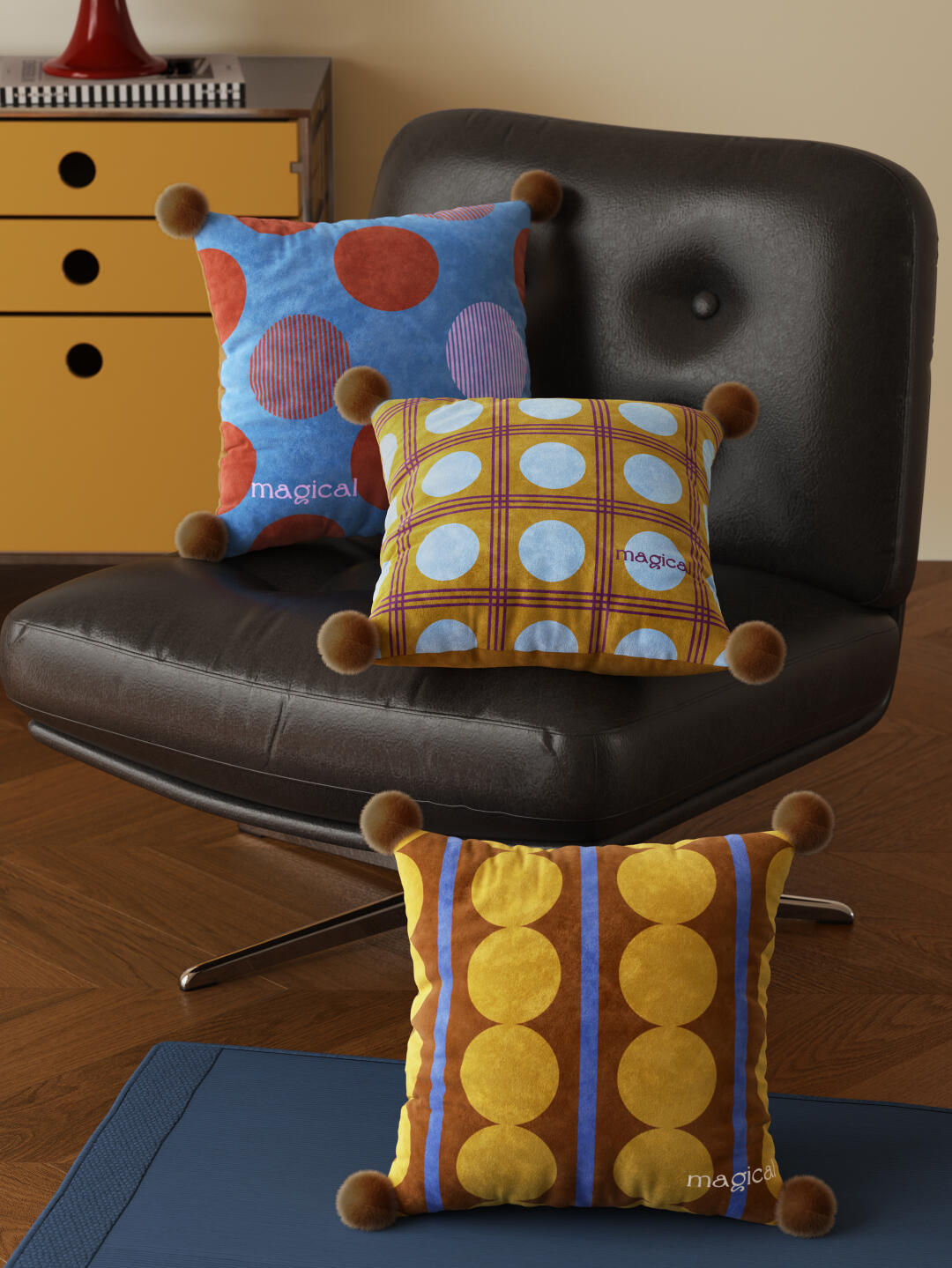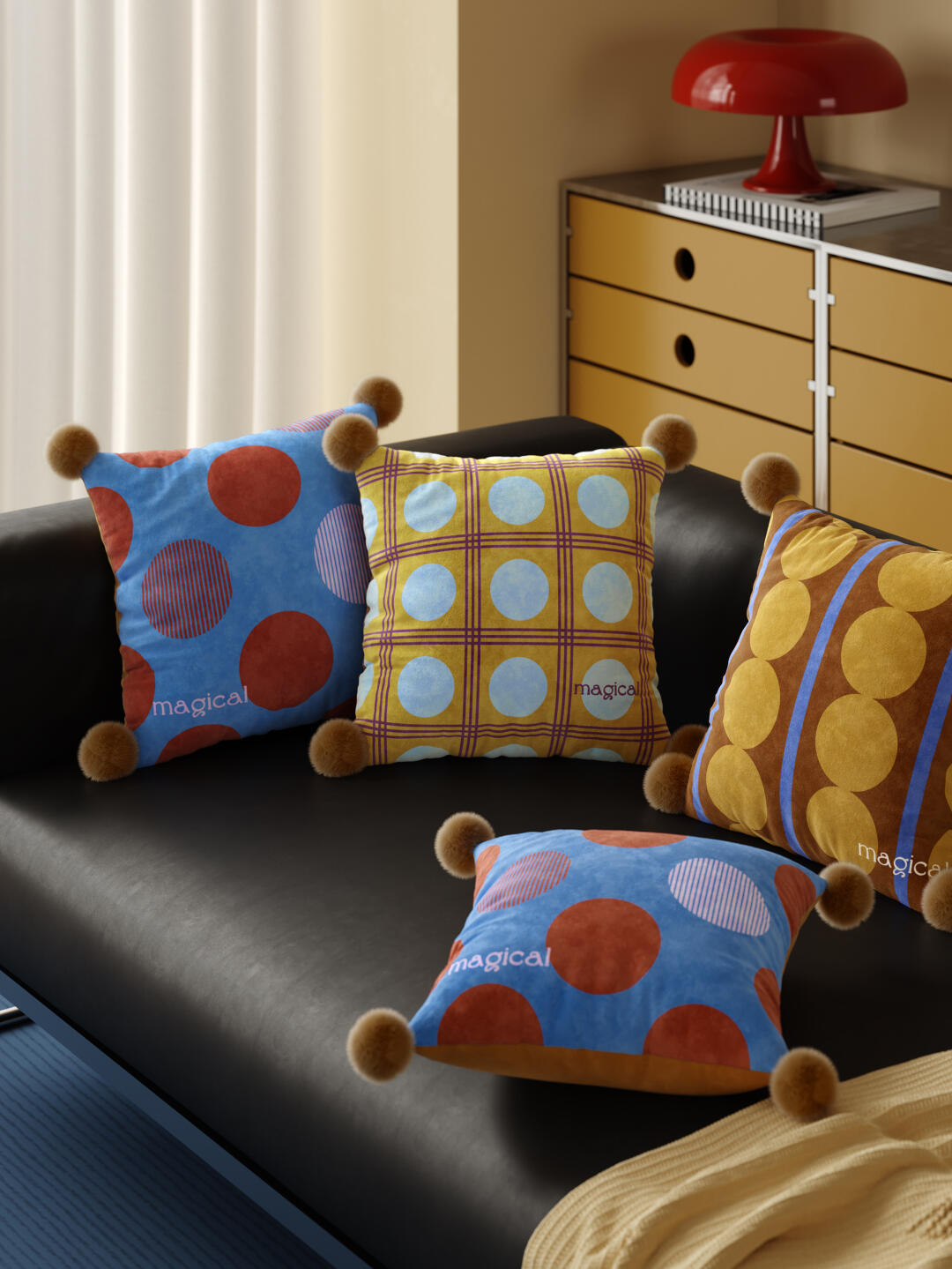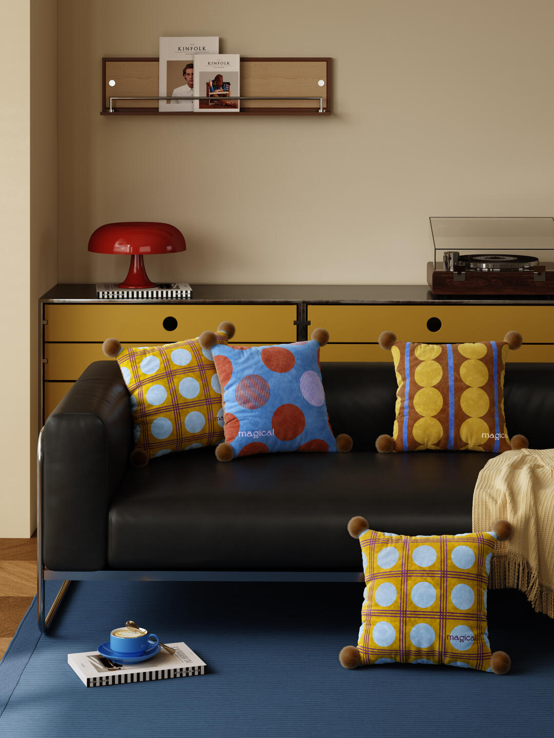 基础圆形元素通过有序排列 形成简洁而富有张力的视觉构图 高饱和度的撞色处理 为空间增添一丝复古气息 搭配中古风沙发或包豪斯单椅 几何图案与家具线条自然呼应 低调提升空间艺术层次 -