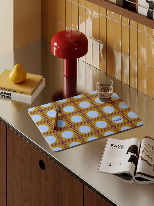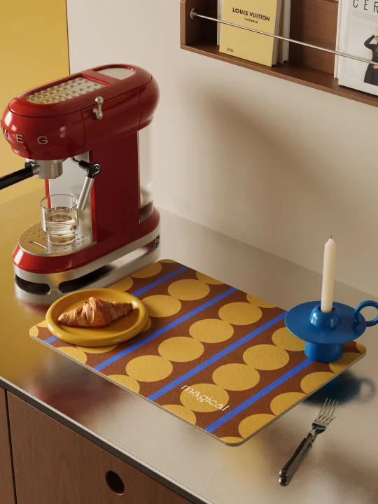 整体以撞色设计为亮点 高饱和配色为空间增添一抹艺术感 搭配polka圆点元素 轻松搭出复古氛围 适合咖啡角、水吧台或厨房台面使用 垫子采用科技皮吸水材质 吸水后能迅速保持桌面干爽 同时也能作为咖啡机或饮水机的隔热垫 一件提升家居格调的装饰好物! -