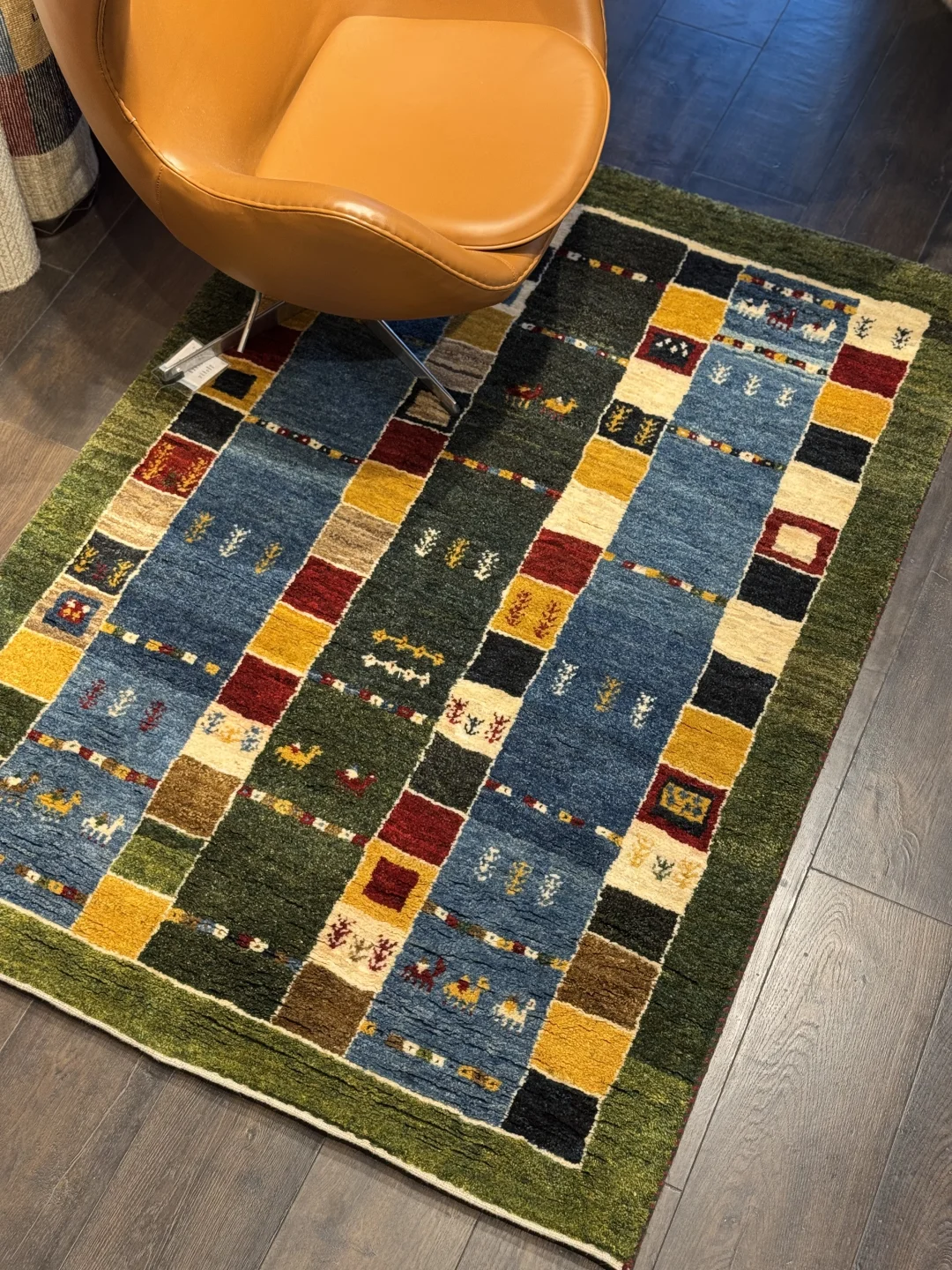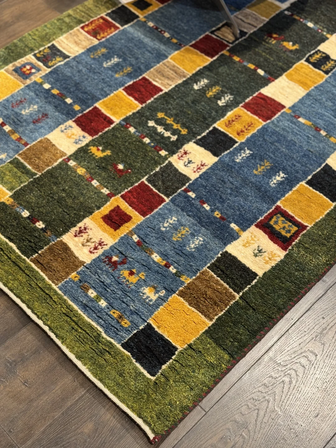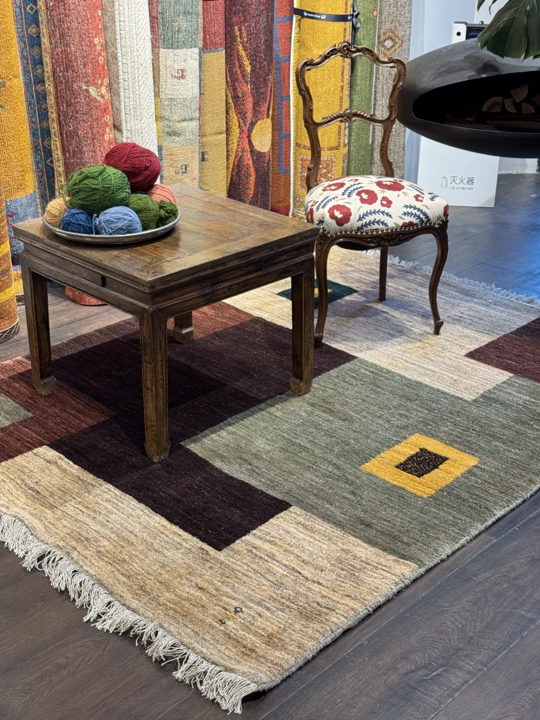 🪬Gülizar 手工羊毛地毯🔥🥳🥳 材质:100% 羊毛 产地:伊朗 ⬇️⬇️150x200cm左右尺寸现代Gabbeh地毯 设计去繁就简,通常是带有骆驼、马匹、人物形象的田野风光,又或者是五颜六色的带状图案,这些属于抽象的棋盘格设计。