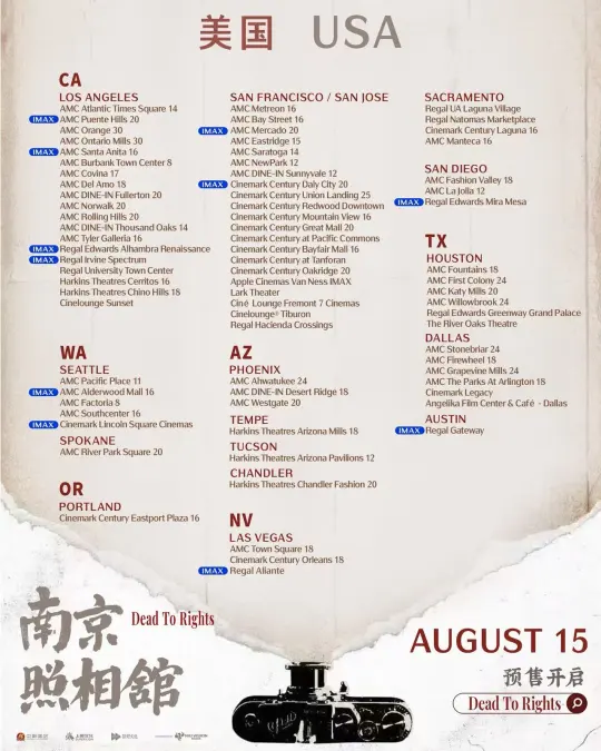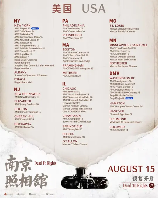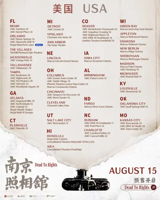 1945.8.15,日本投降。 2025.8.15,《南京照相馆》登陆北美——这不是巧合,是历史的回响。 豆瓣高达8.6分🔥,票房已破20亿,年度口碑最高的华语电影!与以往战争片不同,它用一间小小的照相馆,冷静却震撼地揭开日本人在南京的罪行,让人看得屏息。 身在海外的我们,更要让世界听见真相。每一张电影票,都是一次向世界的发声——告诉他们,这段历史不该被遗忘。 🎟 北美/澳新各大院线预售已开 🔍 搜索 Dead To Rights 查询影院和场次,西雅图的场次戳图2