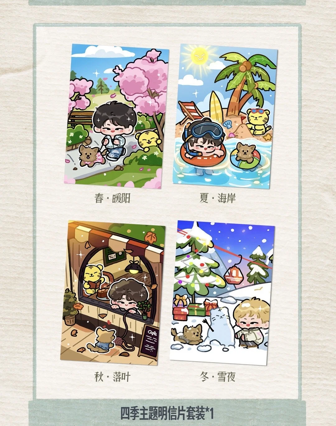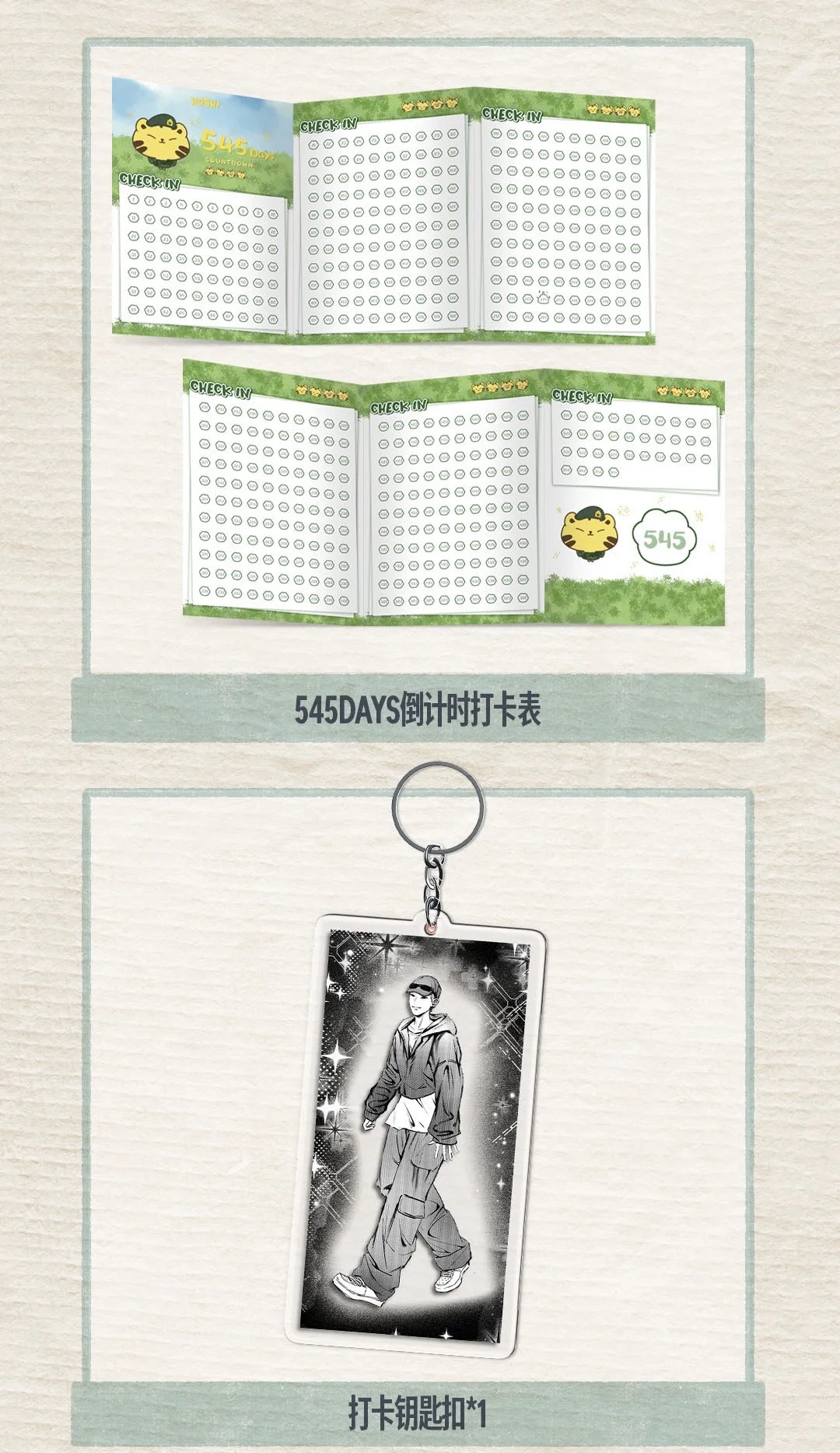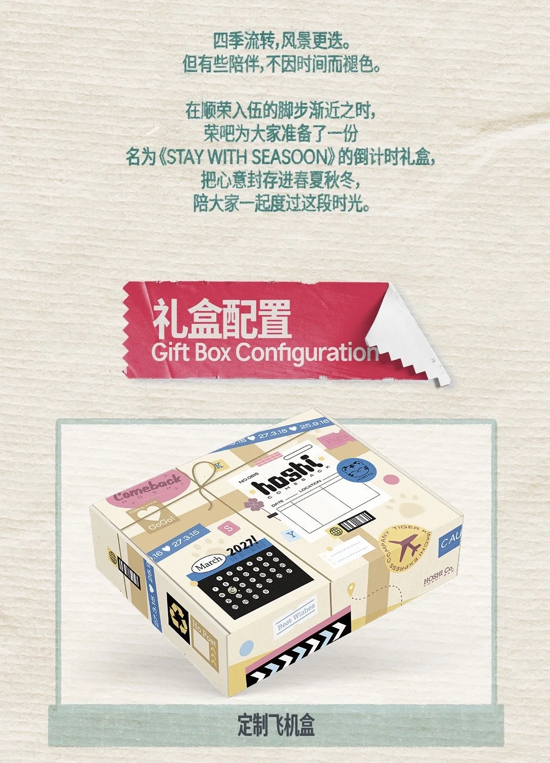 💝礼盒配置: ▪️定制飞机盒 ▫️545P倒计时台历*1 ▪️定制活页日程本(A5 80P)*1 ▫️545DAYS倒计时打卡表*1 ▪️打卡钥匙扣*1 ▫️星星衍射卡*1 ▪️8cm+5cm屁屁夹*3 ▫️四季主题明信片套装*1 ▪️Latte Time贴纸*1 四季流转,风景更迭。 但有些陪伴,不因时间而褪色。 在顺荣入/伍的脚步渐近之时,荣吧为大家准备了一份名为 《Stay with Seasoon》 的倒计时礼盒,把心意封存进春夏秋冬,陪大家一起度过这段时光。