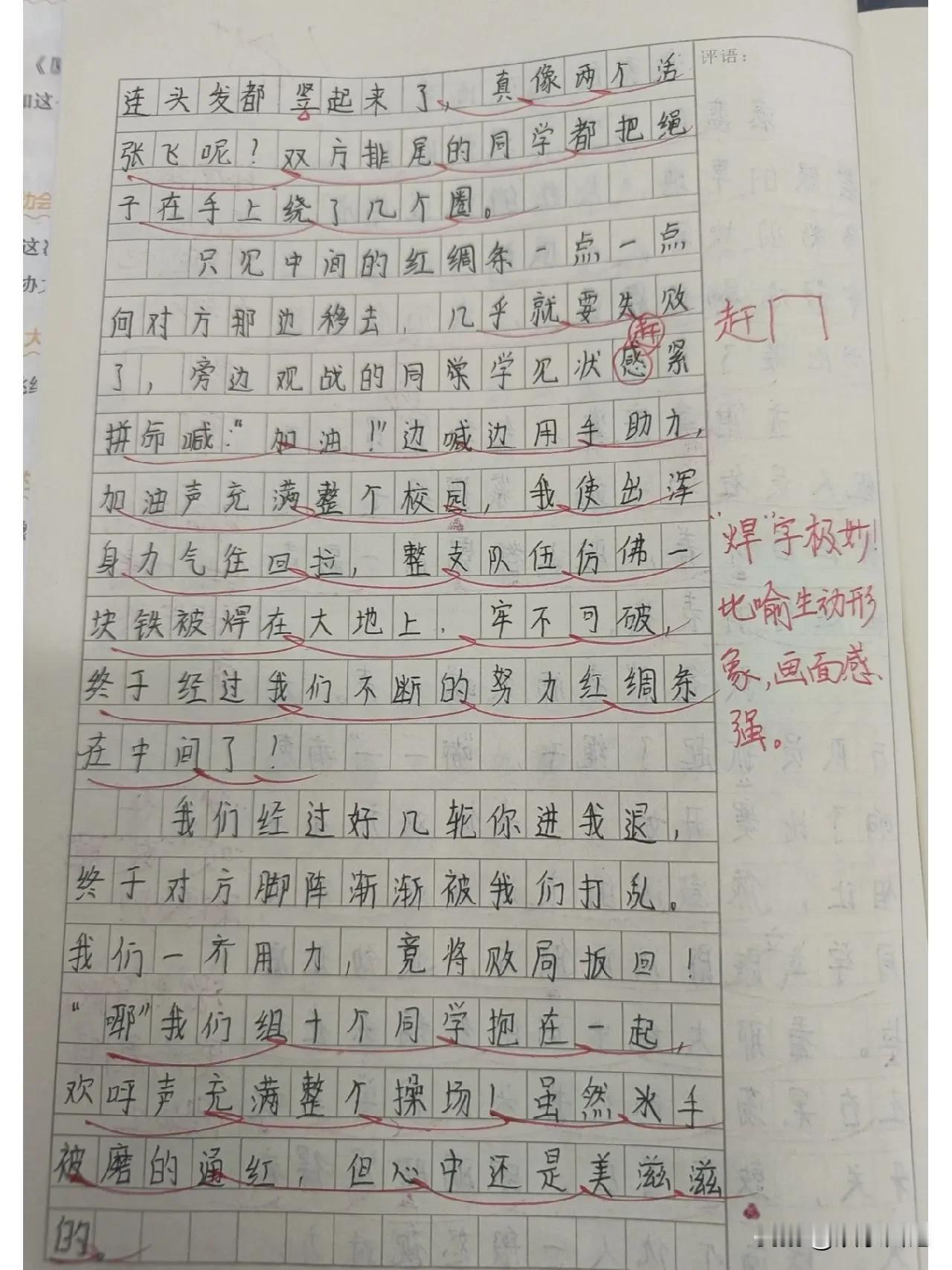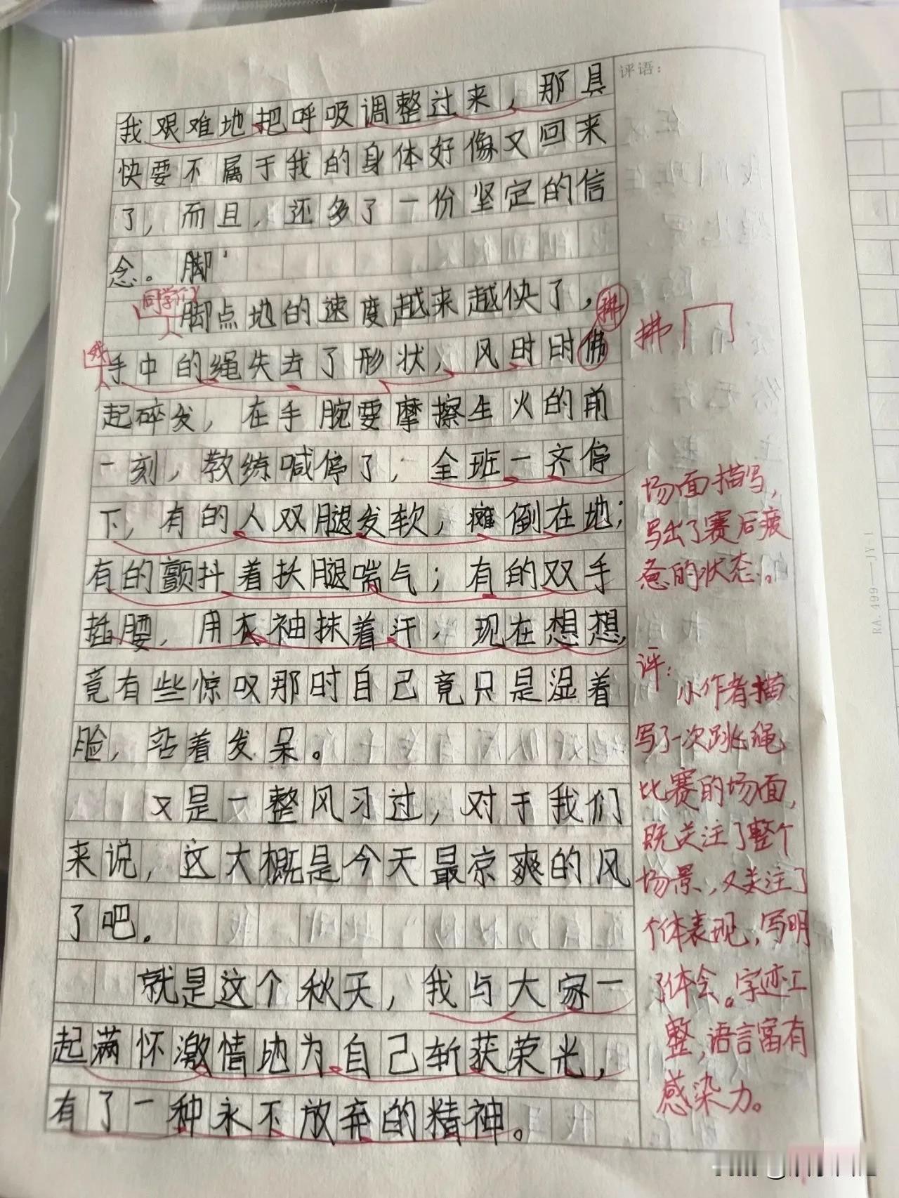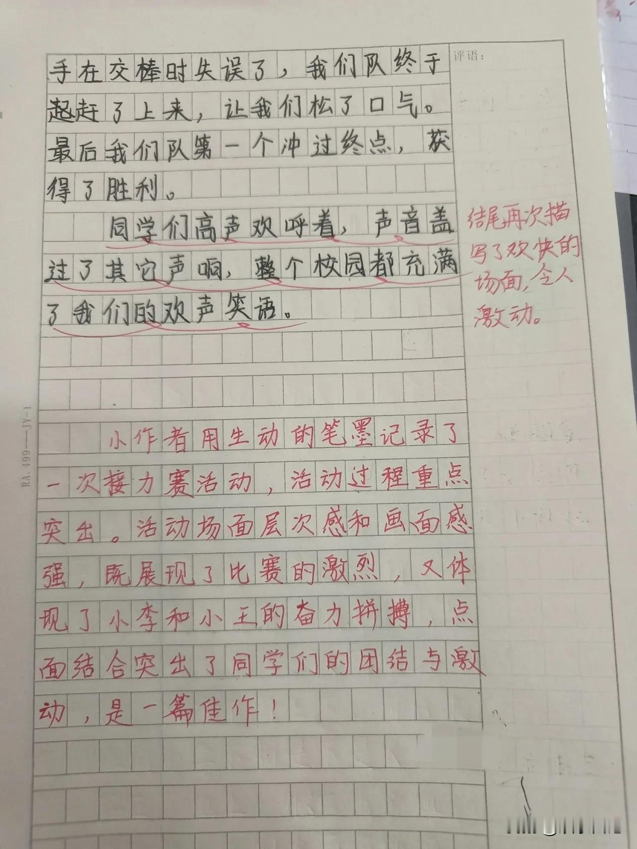 偷偷告诉你,优秀作文来啦!! 都说作文是语文的半壁江山,能写好作文,就不怕语文成绩差。反之,写不好作文语文成绩想好也难哦。 我们小时候写作文全靠想象力,没出过远门,见识不多,想要多看书也是资源有限,能够借鉴的内容太少少,写作文就像记流水账,干巴巴的。 整理孩子们的作业本发现了这几篇老师批注的作文,突然觉得现在的孩子作文水平好多了。她们不再生搬硬套,作文字里行间能看出文字的温度,读起来似乎就在孩子作文的场景中,画面栩栩如生,特别有力度。 所以作文并不是写不好,而是要多花心思观察生活,留意生活的细节,把自己平时积累的及时补充到作文里。这就要读万卷书,还要行万里路,开阔眼界。作文想不好都难。分享孩子作文