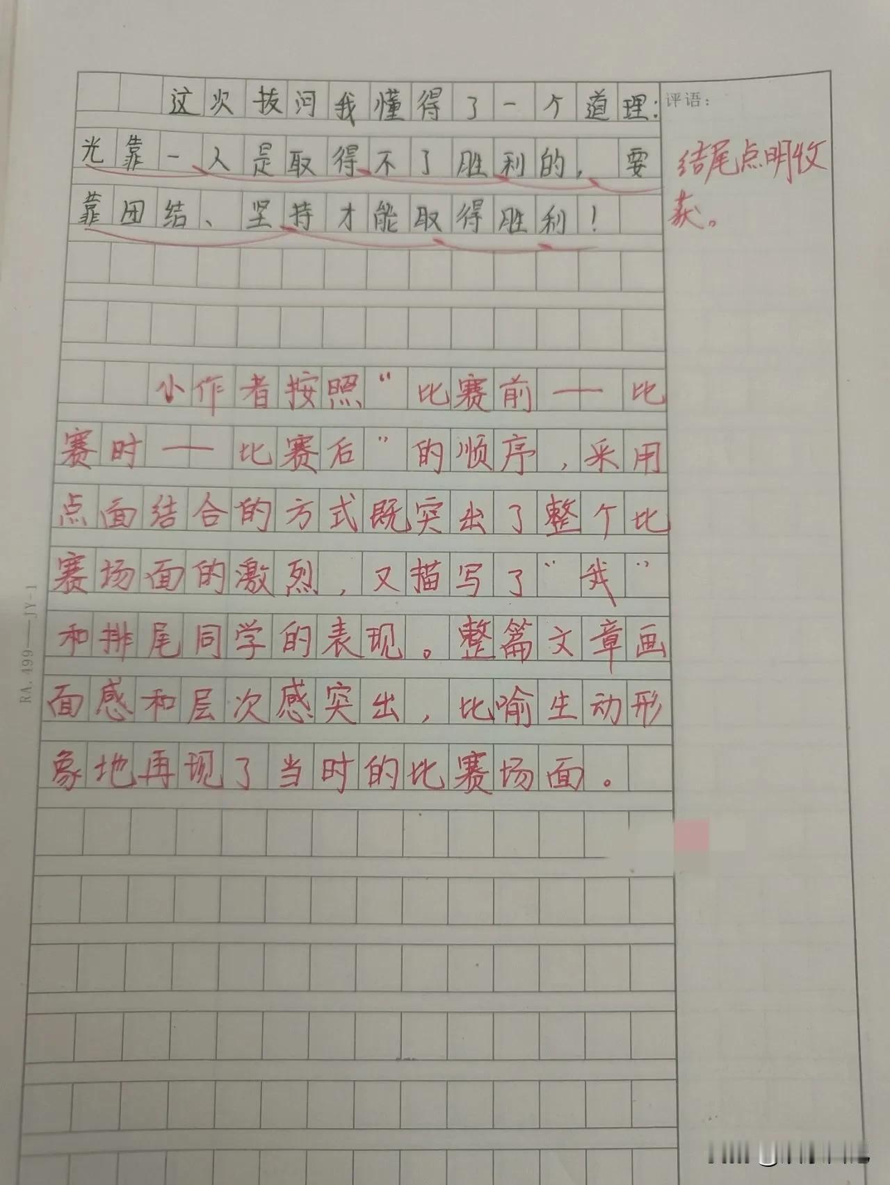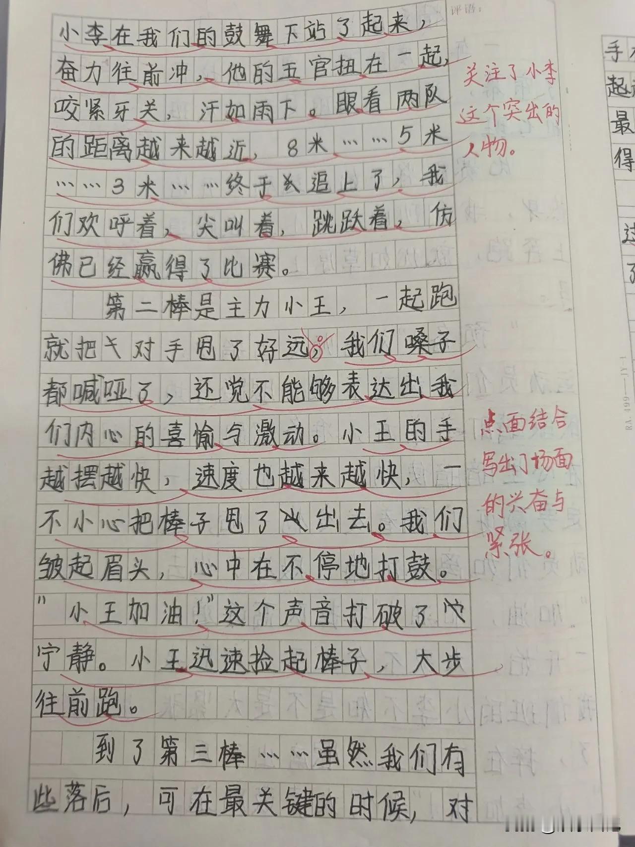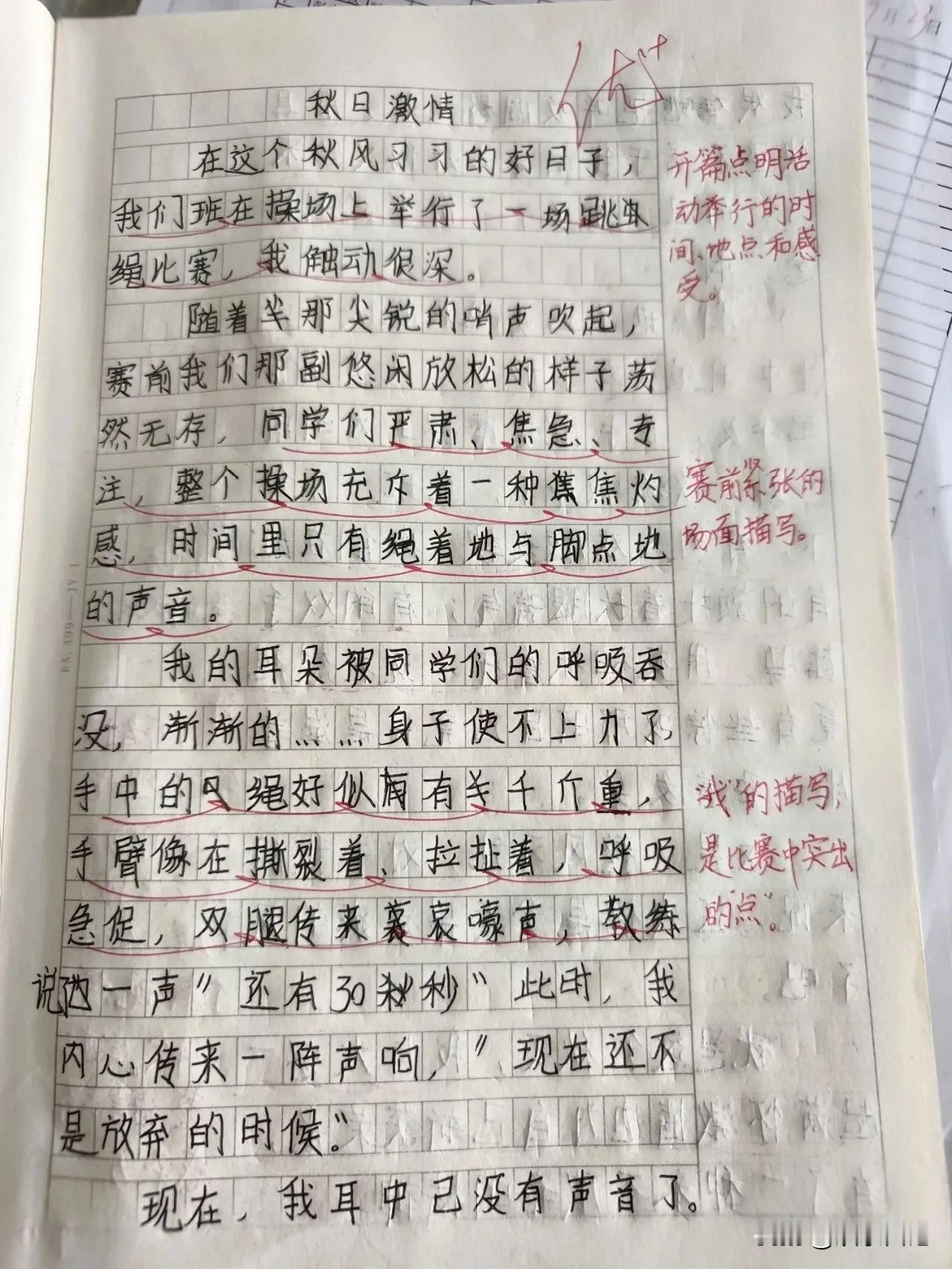 偷偷告诉你,优秀作文来啦!! 都说作文是语文的半壁江山,能写好作文,就不怕语文成绩差。反之,写不好作文语文成绩想好也难哦。 我们小时候写作文全靠想象力,没出过远门,见识不多,想要多看书也是资源有限,能够借鉴的内容太少少,写作文就像记流水账,干巴巴的。 整理孩子们的作业本发现了这几篇老师批注的作文,突然觉得现在的孩子作文水平好多了。她们不再生搬硬套,作文字里行间能看出文字的温度,读起来似乎就在孩子作文的场景中,画面栩栩如生,特别有力度。 所以作文并不是写不好,而是要多花心思观察生活,留意生活的细节,把自己平时积累的及时补充到作文里。这就要读万卷书,还要行万里路,开阔眼界。作文想不好都难。分享孩子作文