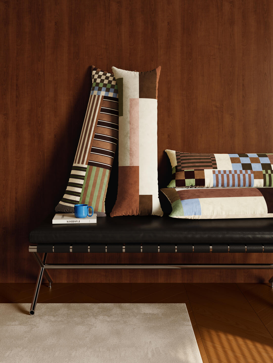 新入手的沙发🛋️抱枕 采用当下流行的Patchwork拼色设计 将复古几何元素巧妙融合 条纹与格纹不规则交织 呈现独具个性的后现代风格 为家居氛围注入几分内敛的前卫感 长条枕型实用度很高 适合作为靠枕或睡眠时环抱 带来舒适安心的使用体验 -