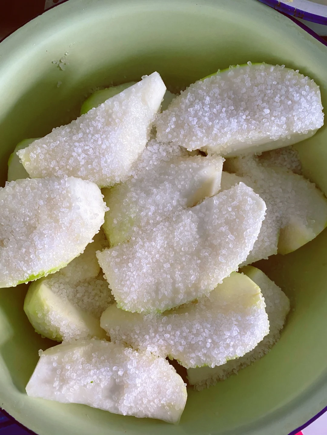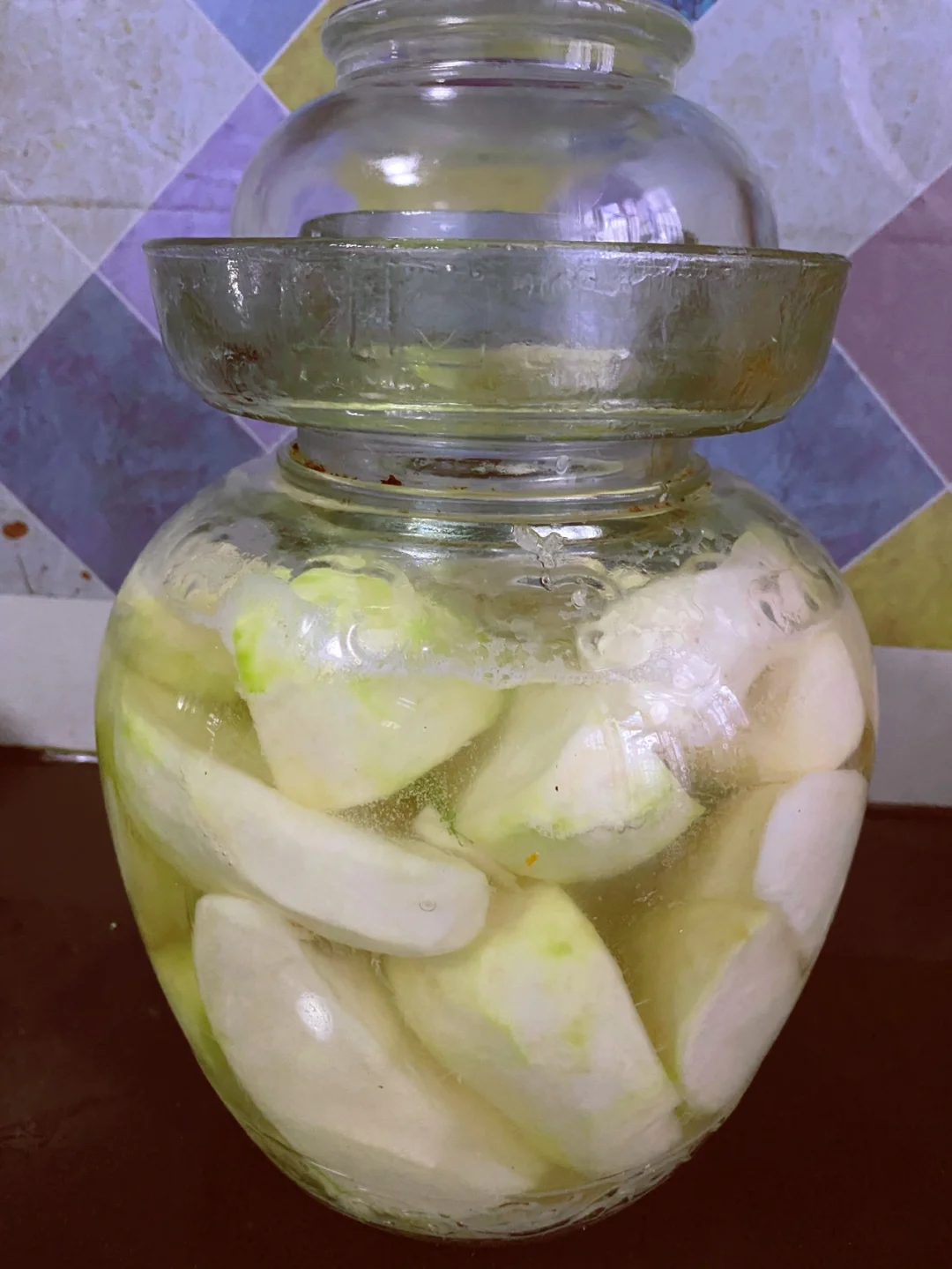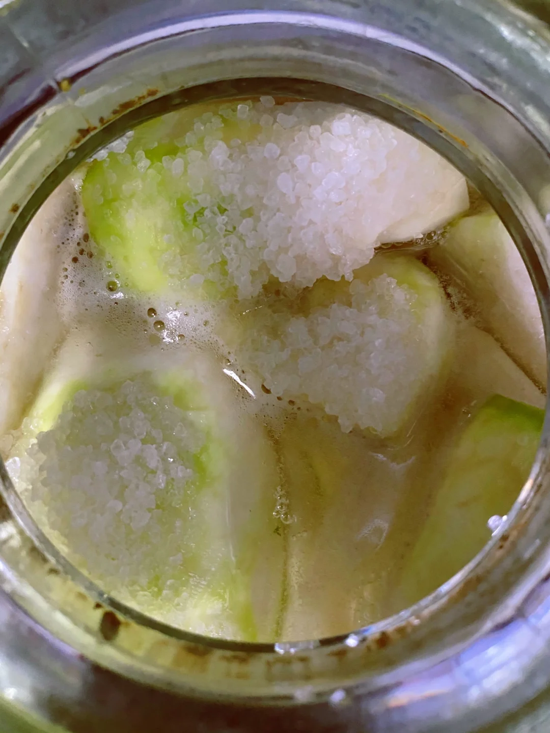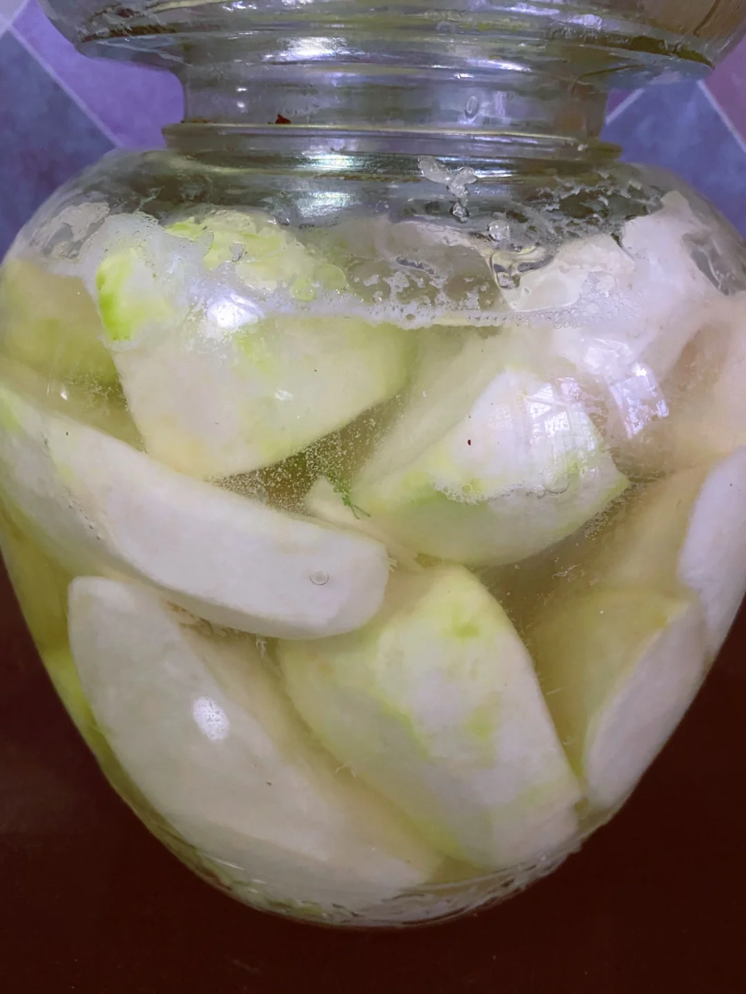 又到了腌泡菜的季节 把清理好的芥菜疙瘩清洗干净,把表面的水分晾干 把玻璃罐子清洗干净,用开水烫一下。 放一层芥菜疙瘩,放一层盐,最后上面再放一层盐 咱们这个芥菜疙瘩不用加水,等盐化了之后,芥菜疙瘩那个水分出来,自己就没过芥菜疙瘩了。 这个是腌制三天的效果,一点水都不用放,芥菜自己出来的水,就把芥菜没过来了。 这样腌的芥菜疙瘩一点毒都不涨。