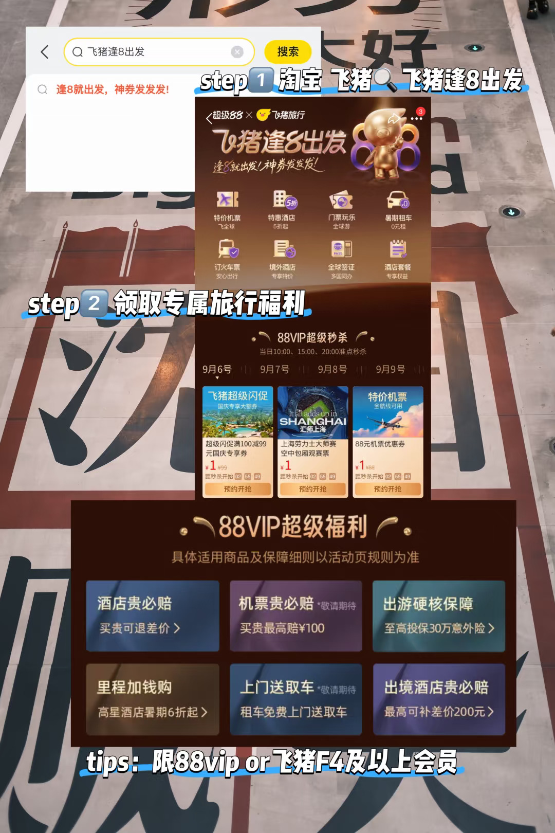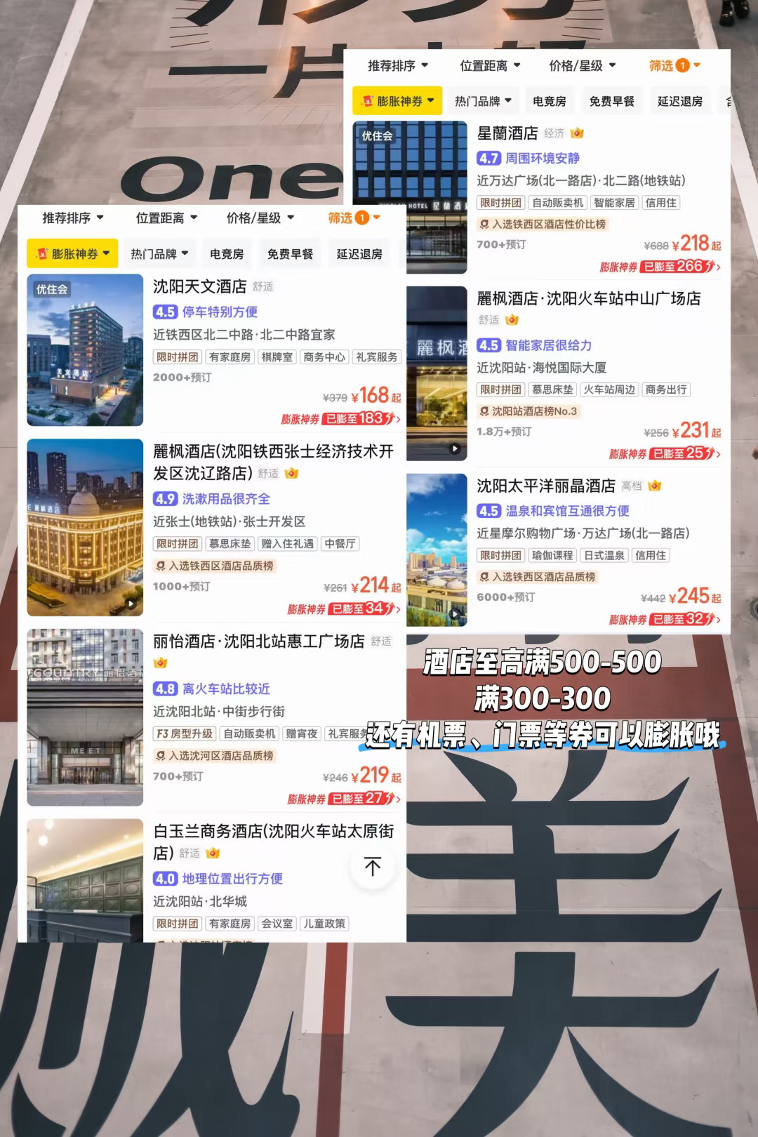 ✅推荐路线 Day1 • 上午:打卡沈阳故宫,红墙黄瓦超震撼,大政殿和十王亭必看哦! • 中午:到中街逛吃,美食选择丰富,还可顺便到盛京大家庭打卡(沈阳贼美和四楼故宫全景观景台) • 下午:参观张学良旧居,感受民国风情,从大帅府出来步行至小南教堂,邂逅欧式浪漫。 Day2 • 上午:逛小河沿早市,邂逅沈阳烟火气。 • 上午:精力充沛的宝子可以安排辽博一日游,沉浸式感受历史文化的魅力。 • 下午:在西塔街吃朝鲜族美食,烤鳗鱼、打糕绝了! • 傍晚:体验“洗浴天花板”舒舒服服洗个澡缓解疲劳。 ✅tips: 1️⃣上飞猪or淘宝🔍【飞猪逢8出发】或者点击左下角按钮直达领取限量优惠券(方式见P2) 2️⃣88vip及飞猪F4即以上可领取 3️⃣对比了我之前订的酒店价格 活动力度 🌟膨胀后酒店至高满500-500,满300-300哦(不同酒店的活动力度不同)👍 📣📣点击左下角直达活动页面,一定要领取哦 ✅交通 🌟地铁是出行首选,目前已开通6条线路,基本覆盖各景点,票价为2-7元。 🌟公交运营时间一般为6:00-22:00左右。 🌟出租车起步价9元,超出后每公里2.4元。 (ps:不建议租车 不好开不好停) ✅住宿建议 🌟中街附近:离景点近,美食丰富,交通便利,适合爱逛的宝子(恒隆、盛京大家庭、大悦城、春天 ) 🌟沈阳站、太原街附近:商圈繁华(西塔、印象城、中兴、太原街步行街)美食多,交通便利