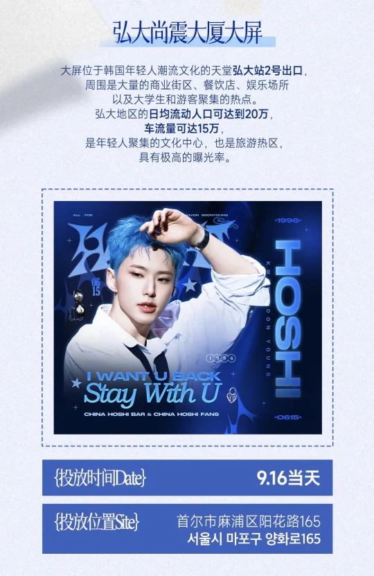 大屏位于韩国年轻人潮流文化的天堂弘大站𝟐号出口,周围是大量的商业街区、餐饮店、娱乐场所以及大学生和游客聚集的热点。弘大地区的日均流动人口可达到𝟐𝟎万,车流量可达𝟏𝟓万,是年轻人聚集的文化中心,也是旅游热区,具有极高的曝光率。