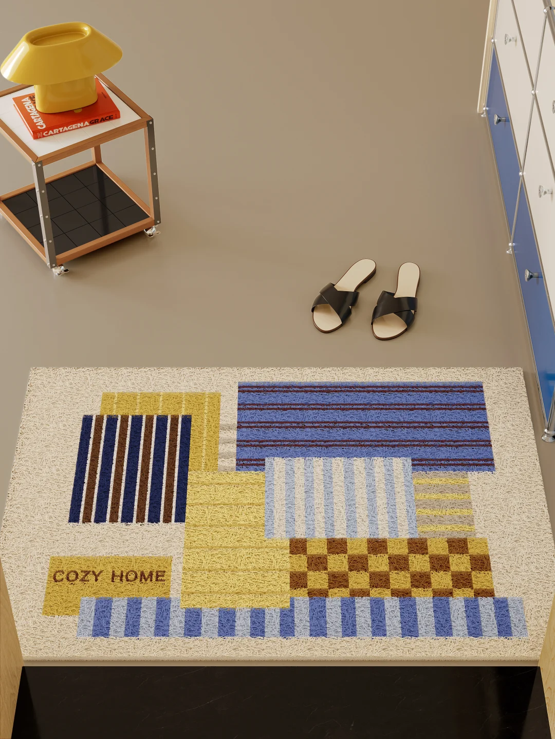 将航海条纹与中古格纹元素融合 采用拼布工艺呈现不规则设计 主调为野麦黄与杜维埃蓝 低调而富有层次感 兼具包豪斯的理性与航海风格的舒展 为进门空间带来自然慵懒视觉氛围 -