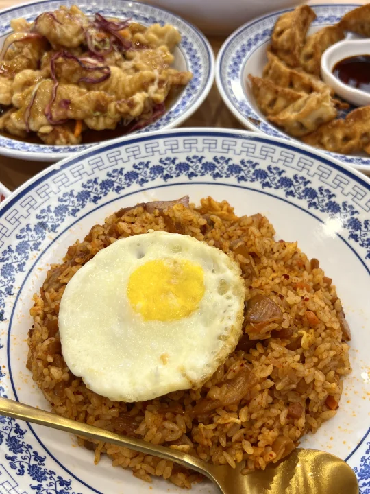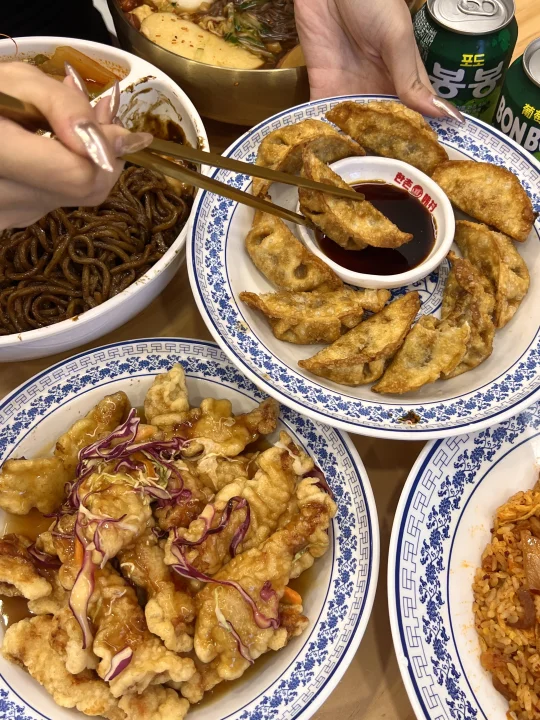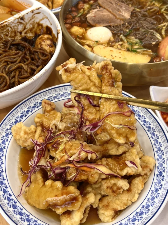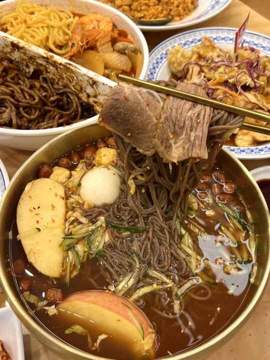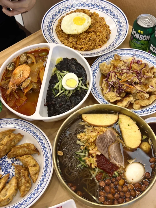 终于在烟台吃到了韩式半半碗!选择困难症有救了!在烟大步行街边上发现的一家韩式炸酱面,进来发现每桌都点了这个半半碗,既想喝点汤又能吃到拌面,这设计简直绝了,而且味道一点不冲突,海鲜面里有虾鱿鱼蛤蜊,我们都很喜欢!辣辣的同时又不失鲜味,糖醋肉煎饺炸的特别脆,糖醋肉有好几种味道的,竟然也能半半?冷面,泡菜炒饭都很不错,其实两个人点一份面都能吃饱,人均也不是太贵,值得来尝尝! 🍜韩村炸酱面