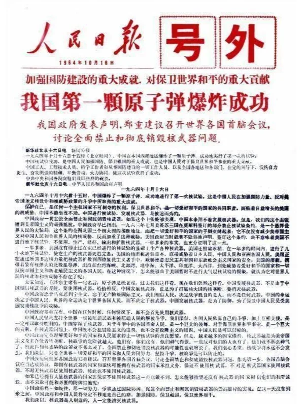 1964年10月16日15时,新疆罗布泊核试验场,一声惊天动地的巨响后,一朵巨大的蘑菇云冲天而起,中国第一颗原子弹爆炸成功!