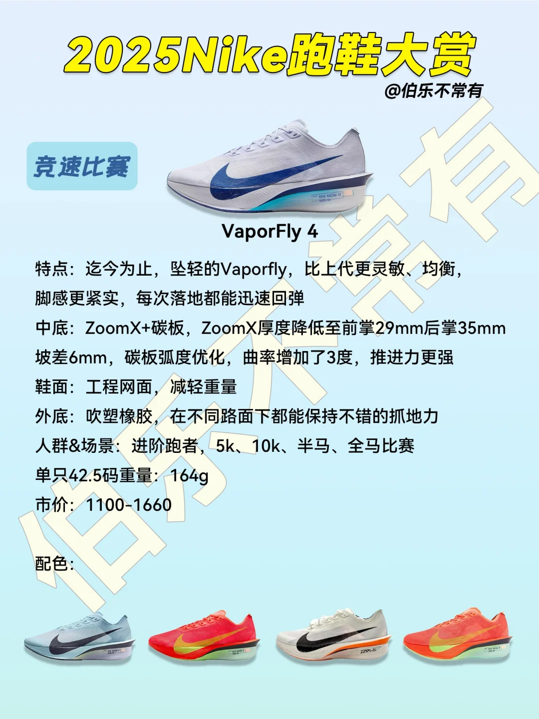 包含这个月新出的4双跑鞋Vaporfly4、Streakfly2、Vomero18、Pegasus Premium。