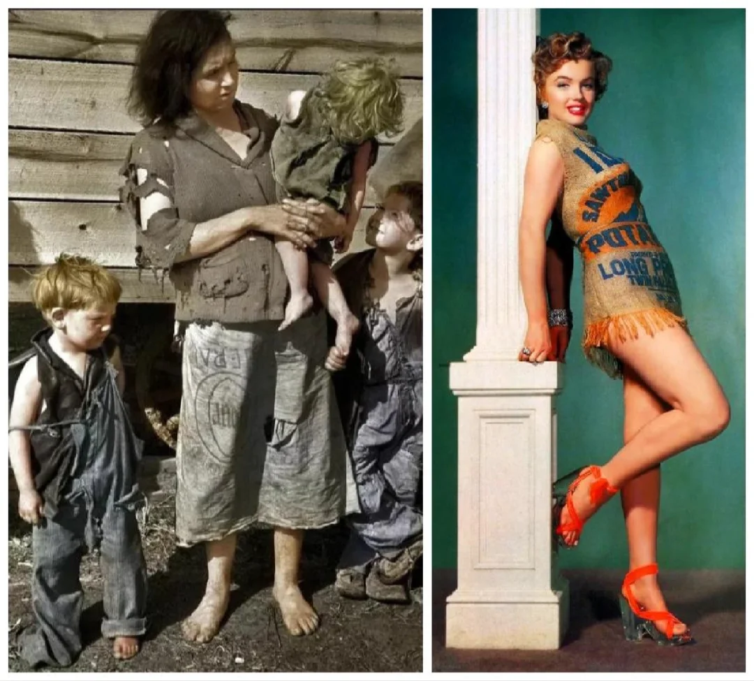 1936年,连年战乱,令我们的先人饱受饥寒之苦。坚毅的母亲带着两个孩子,衣不蔽体的站在门外,等待打仗的爱人归来。 1936年,美国大萧条期时的百姓,拿装土豆的麻袋当裙子穿,与梦露哪款相比,谁的更接地气?