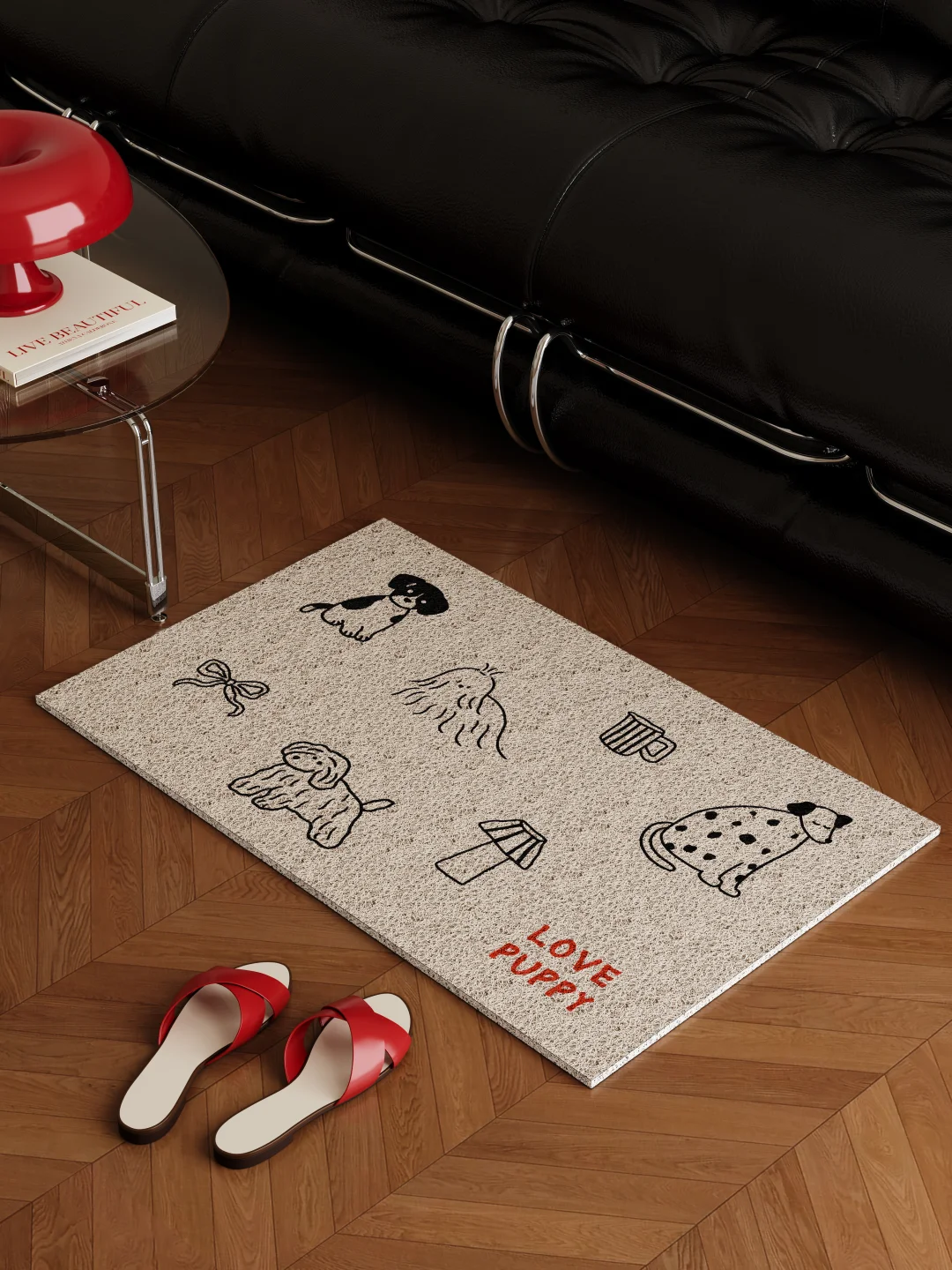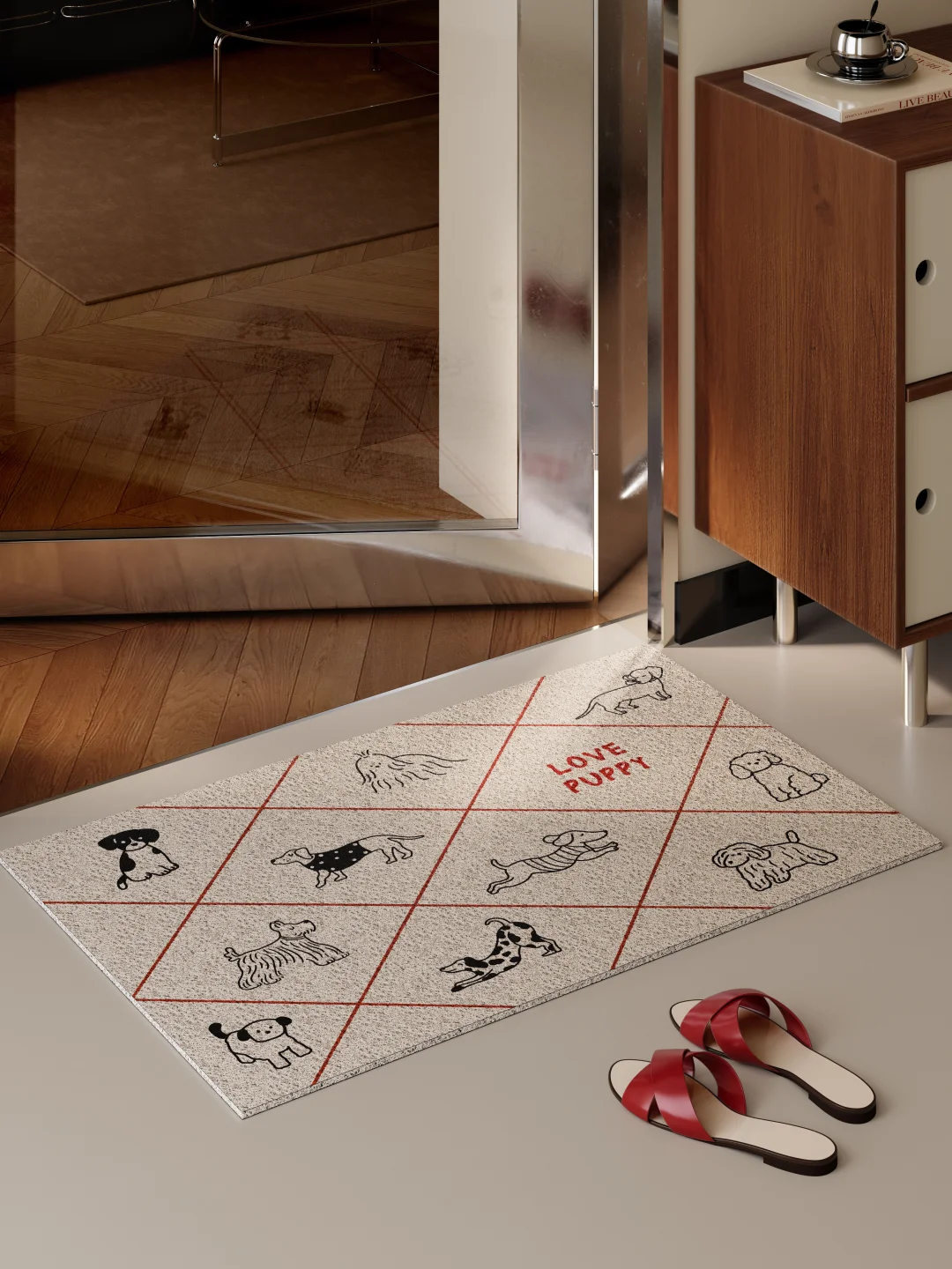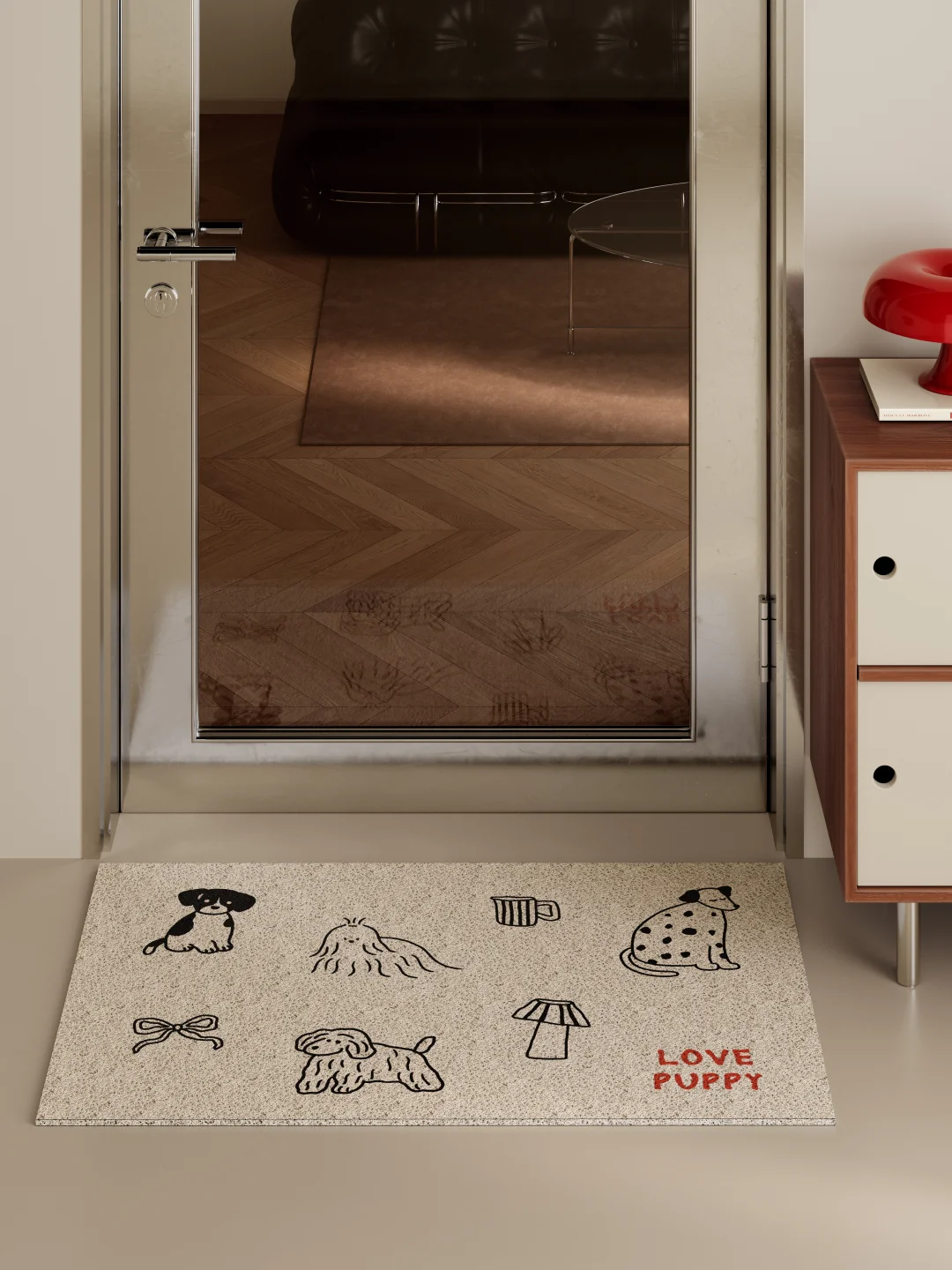 简笔插画风的小狗图案 线条圆润 神态憨萌 搭配细红格纹边框 整体干净又带点复古感 铺在进门处 色调柔和 为秋日家居添一份轻松治愈 低调耐看 日常好打理 -